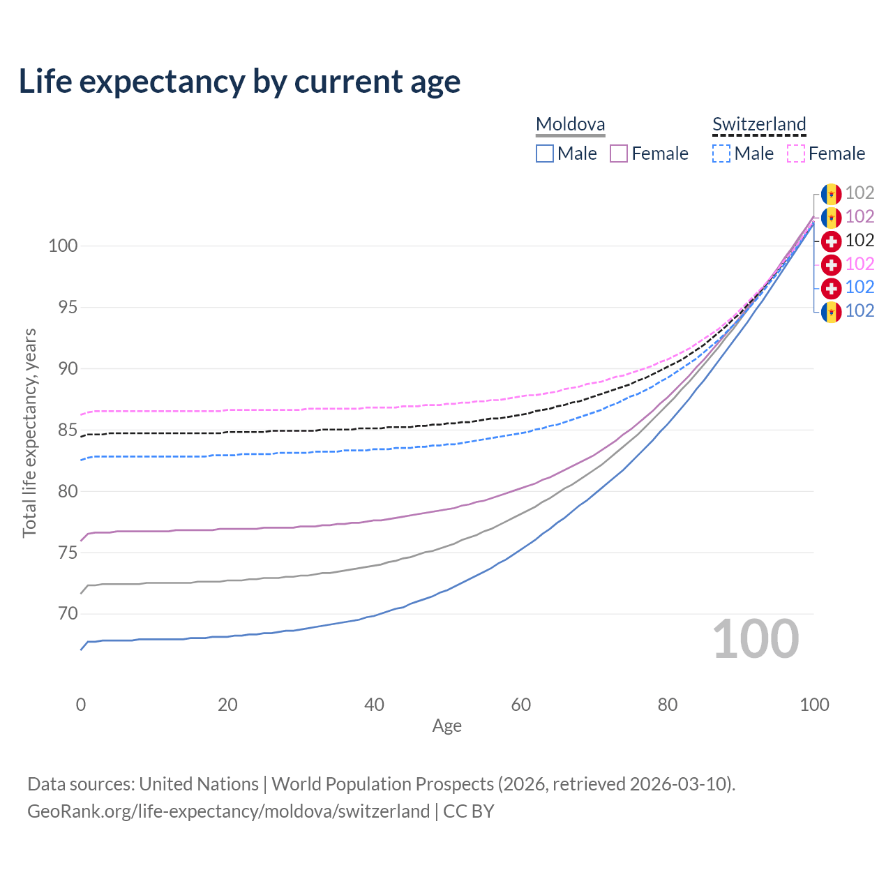 This life expectancy calculator shows the odds of living to 100, 95, 90, and below based on current age for both males and females in Moldova and Switzerland, along with mean and median age of death. The calculations are based on the 2026 life tables (actuarial tables) from the UN World Population Prospects.