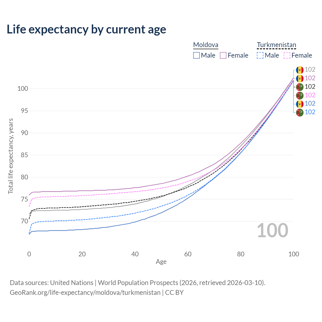 This life expectancy calculator shows the odds of living to 100, 95, 90, and below based on current age for both males and females in Moldova and Turkmenistan, along with mean and median age of death. The calculations are based on the 2026 life tables (actuarial tables) from the UN World Population Prospects.