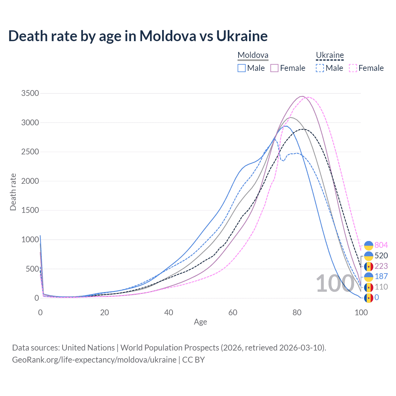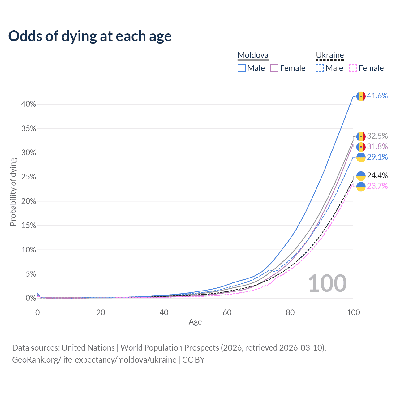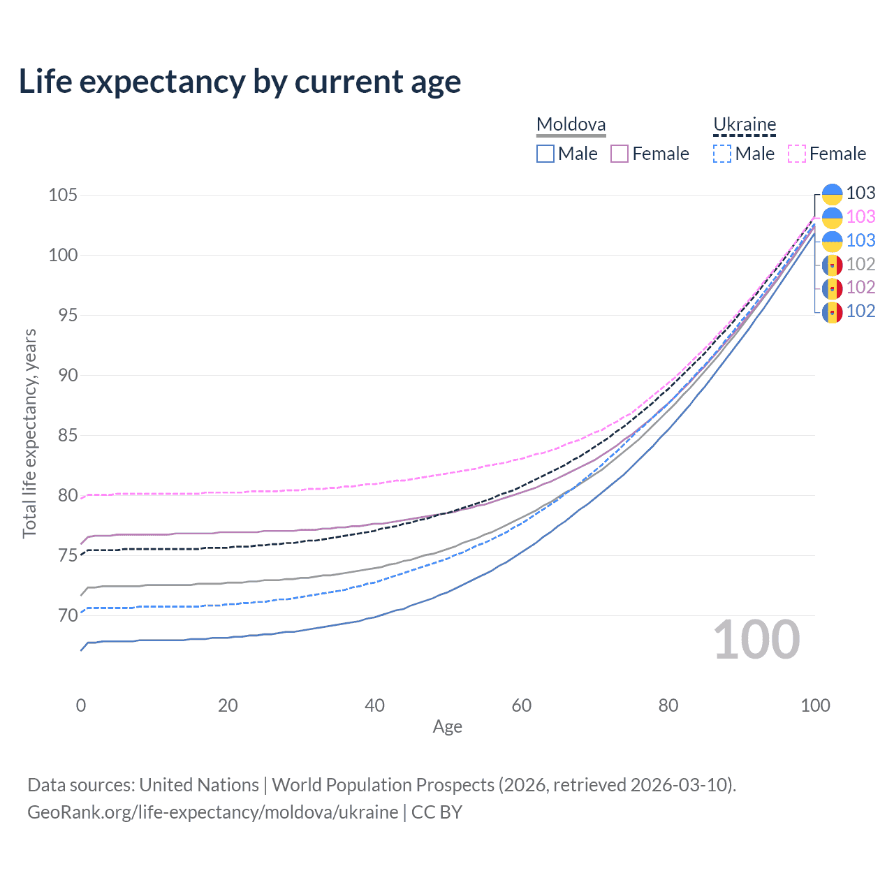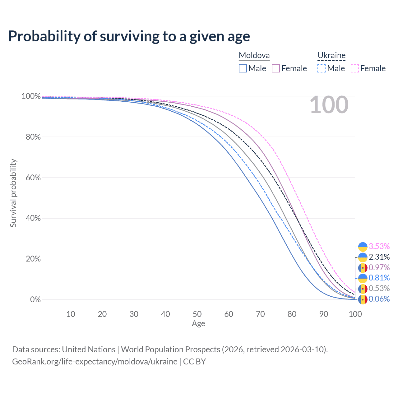 This life expectancy calculator shows the odds of living to 100, 95, 90, and below based on current age for both males and females in Moldova and Ukraine, along with mean and median age of death. The calculations are based on the 2026 life tables (actuarial tables) from the UN World Population Prospects.