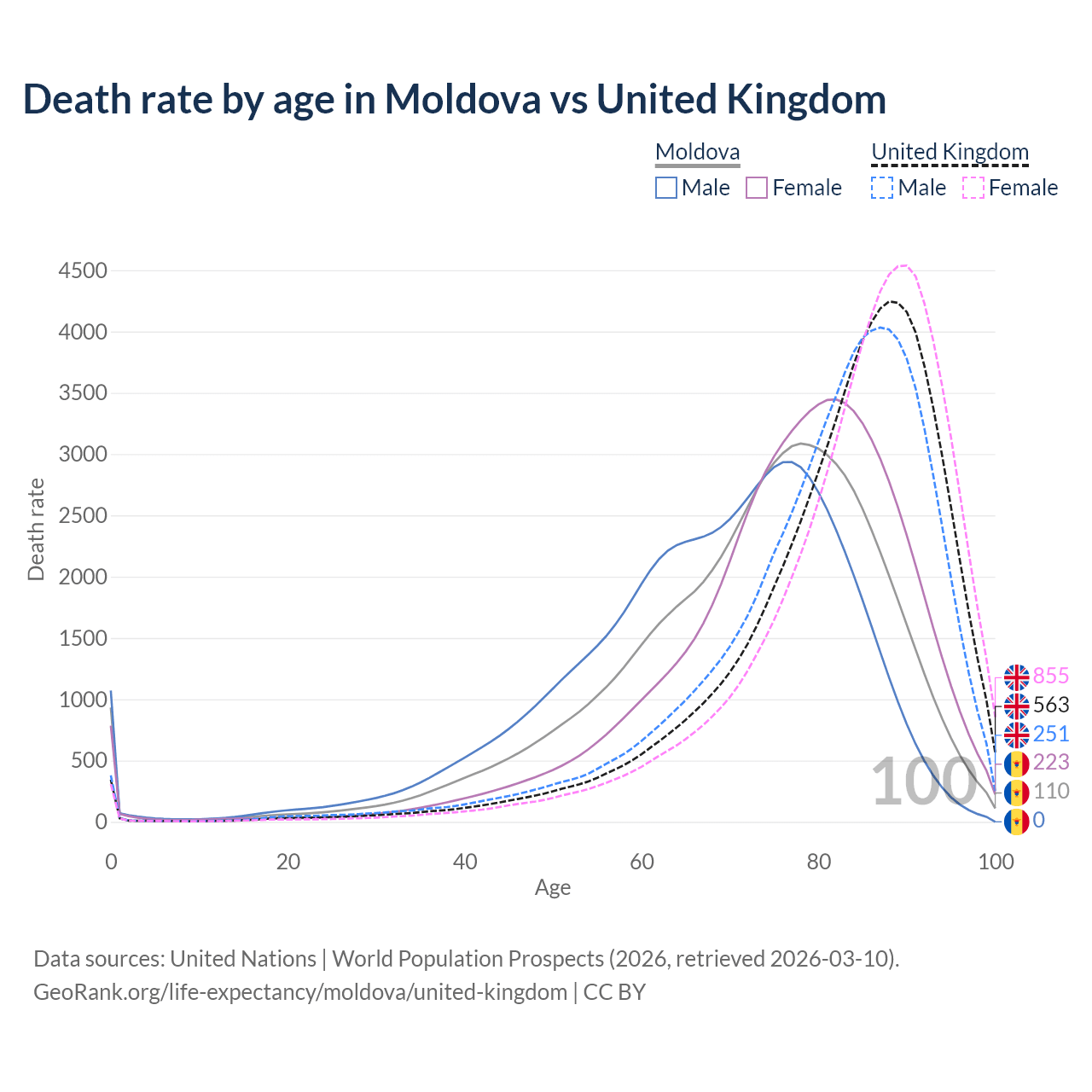 In Moldova, the most common age of death is 78, compared to 88 in the United Kingdom. The median age of death is 74.8 in Moldova and 84.9 in the United Kingdom, meaning only half of each cohort is expected to live past that age.