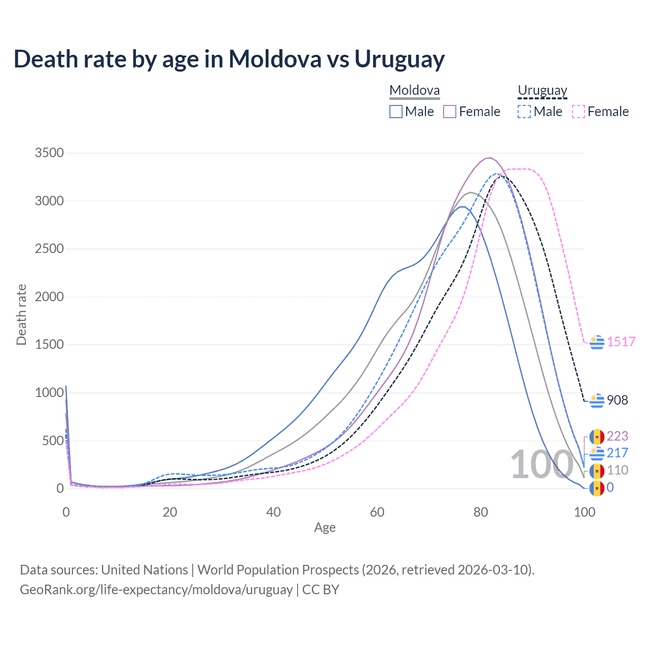 In Moldova, the most common age of death is 78, compared to 84 in Uruguay. The median age of death is 74.8 in Moldova and 81.8 in Uruguay, meaning only half of each cohort is expected to live past that age.