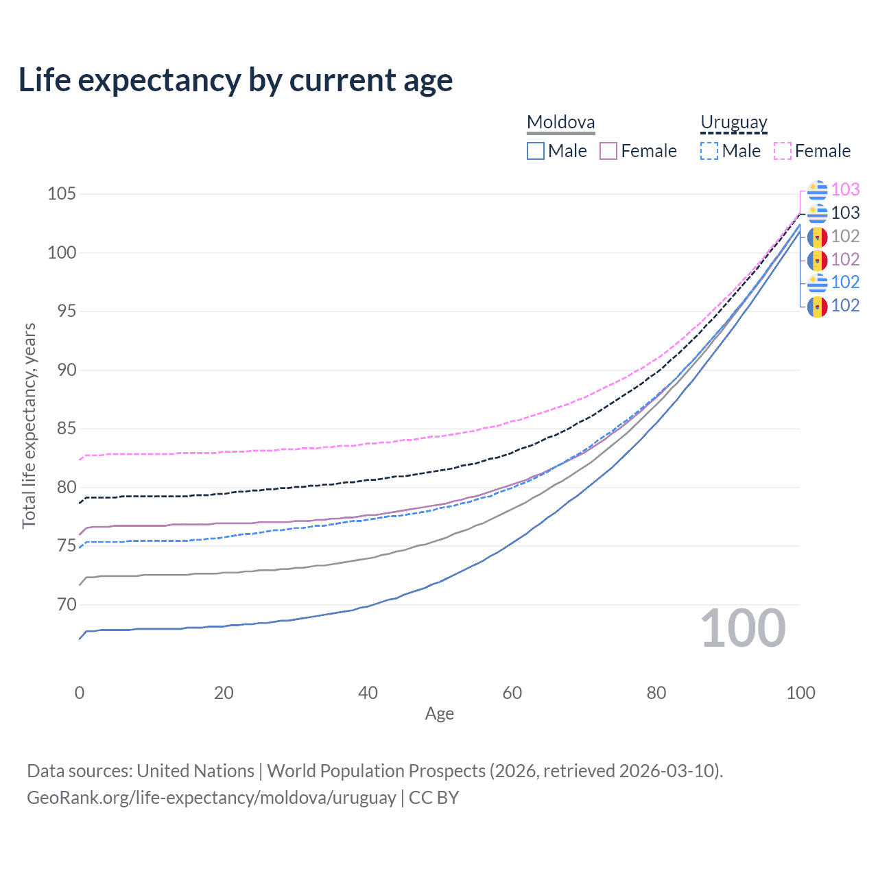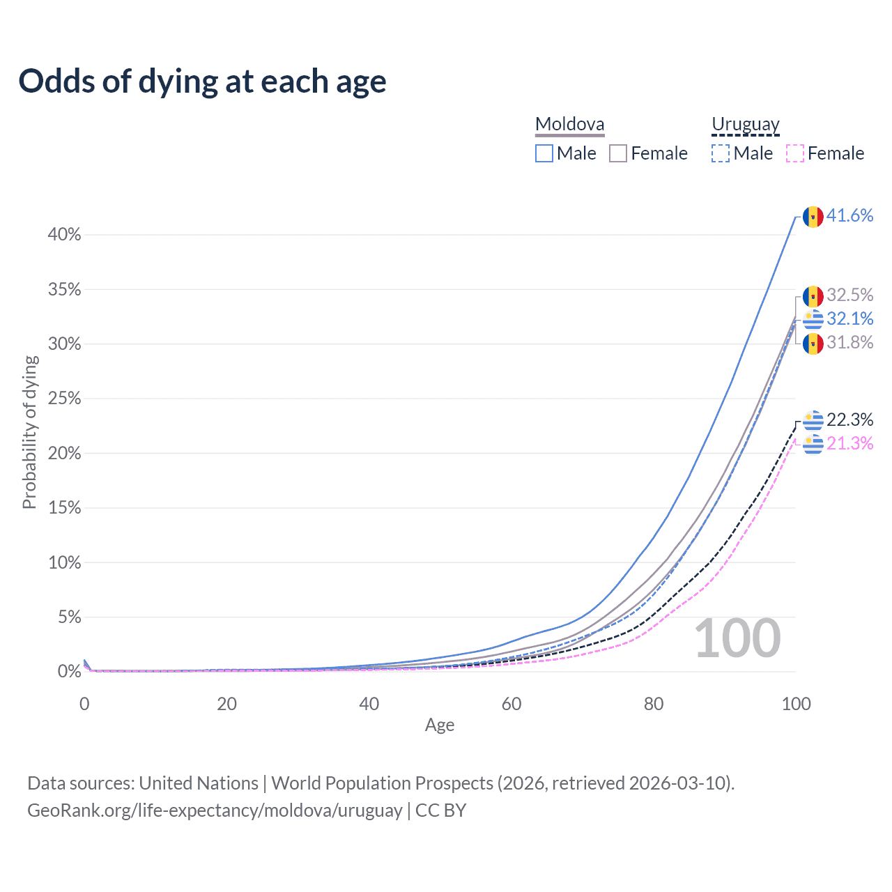 This life expectancy calculator shows the odds of living to 100, 95, 90, and below based on current age for both males and females in Moldova and Uruguay, along with mean and median age of death. The calculations are based on the 2026 life tables (actuarial tables) from the UN World Population Prospects.
