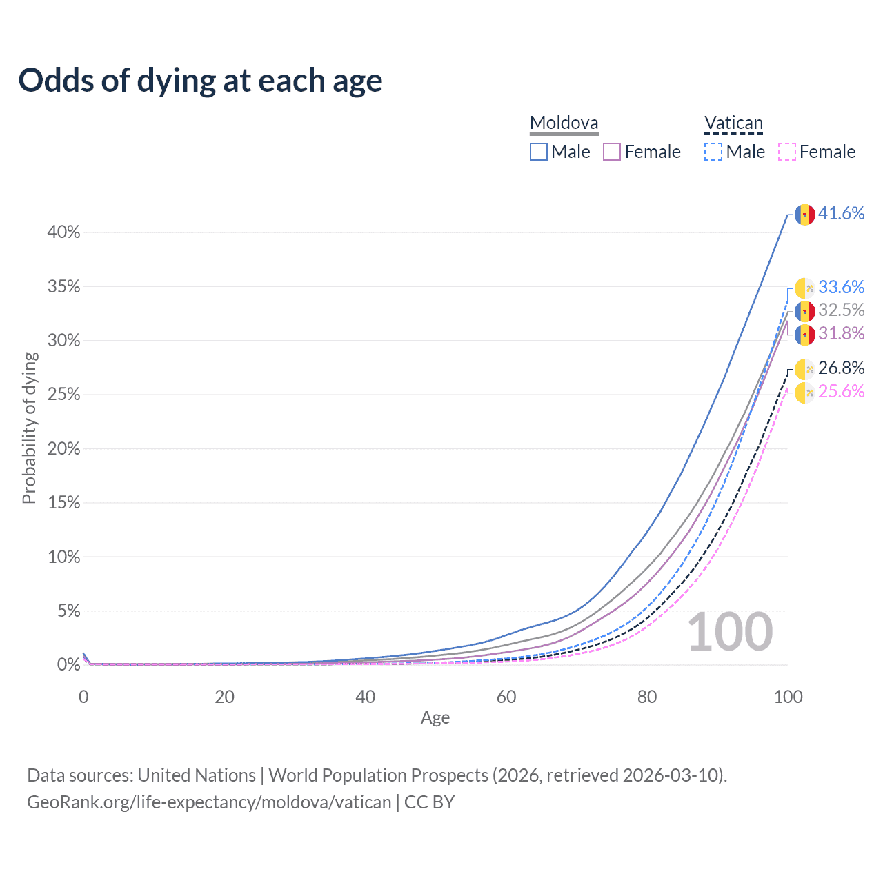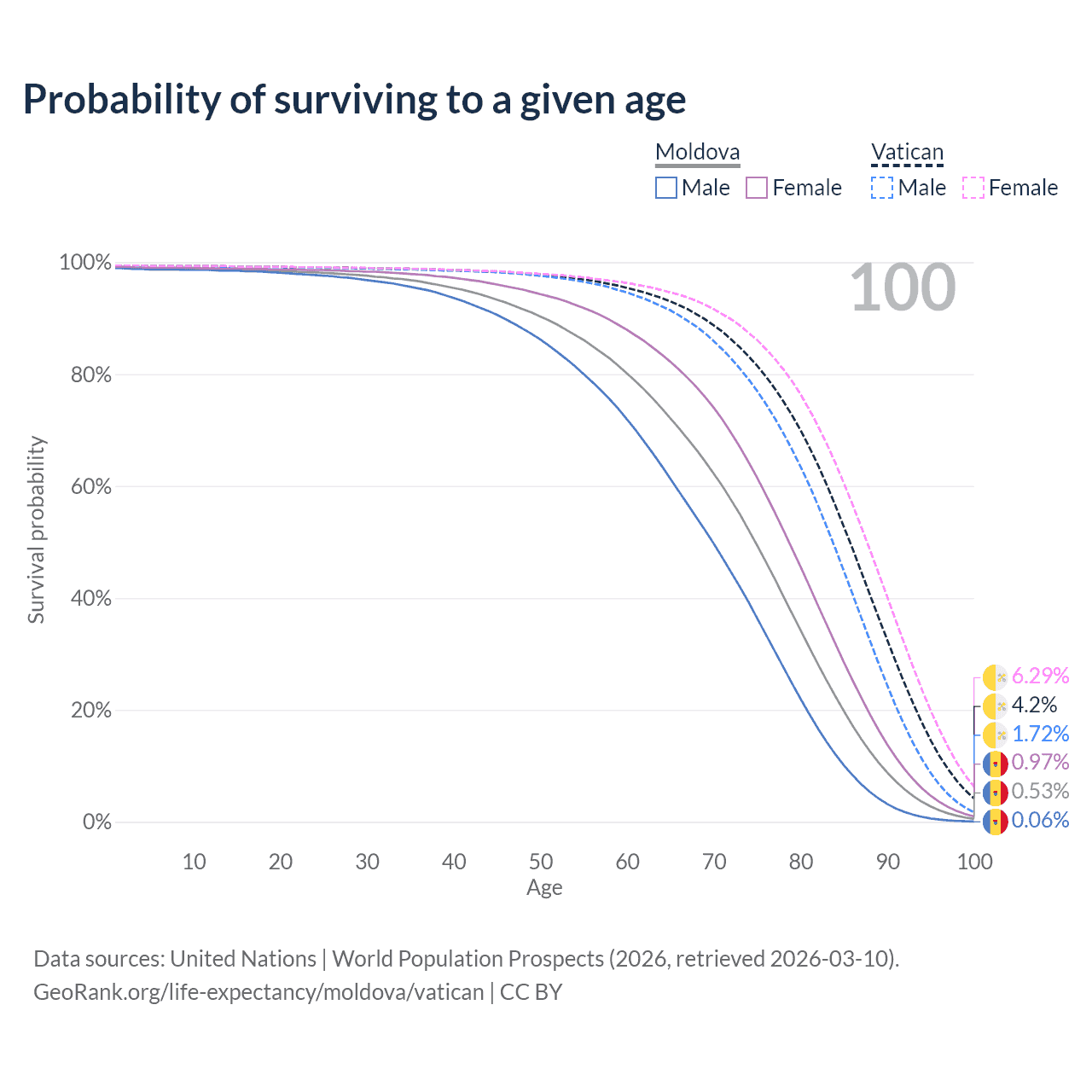This life expectancy calculator shows the odds of living to 100, 95, 90, and below based on current age for both males and females in Moldova and the Vatican, along with mean and median age of death. The calculations are based on the 2026 life tables (actuarial tables) from the UN World Population Prospects.
