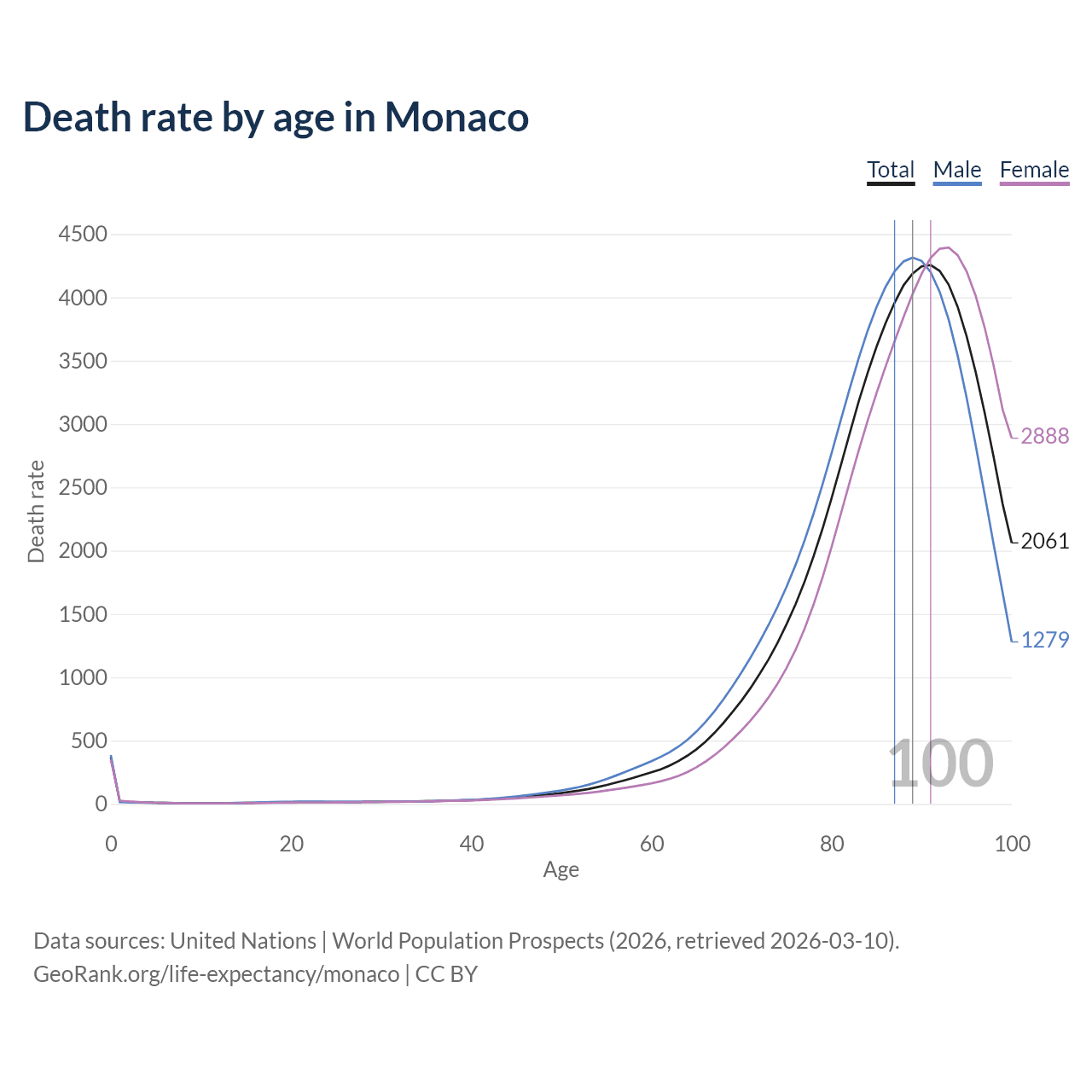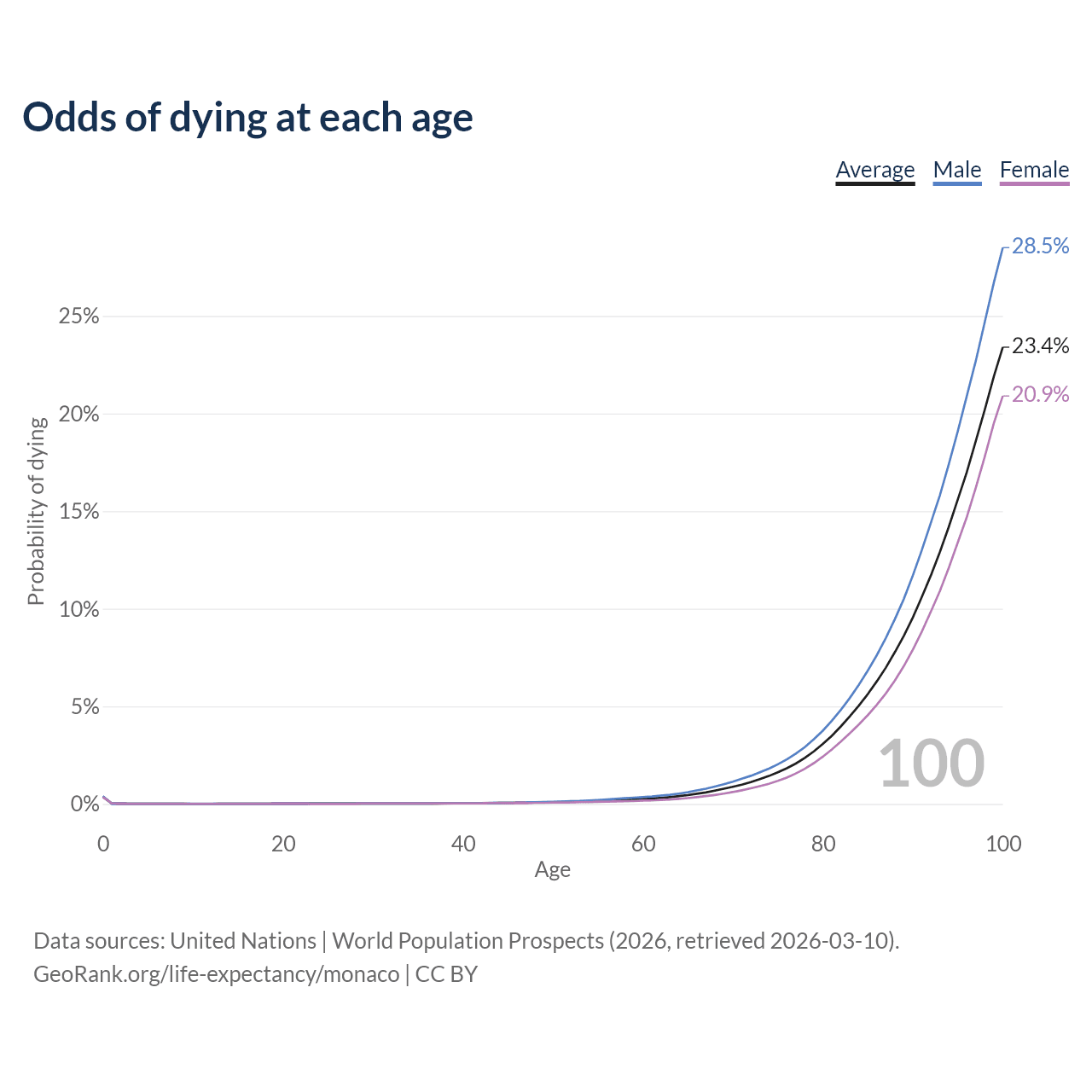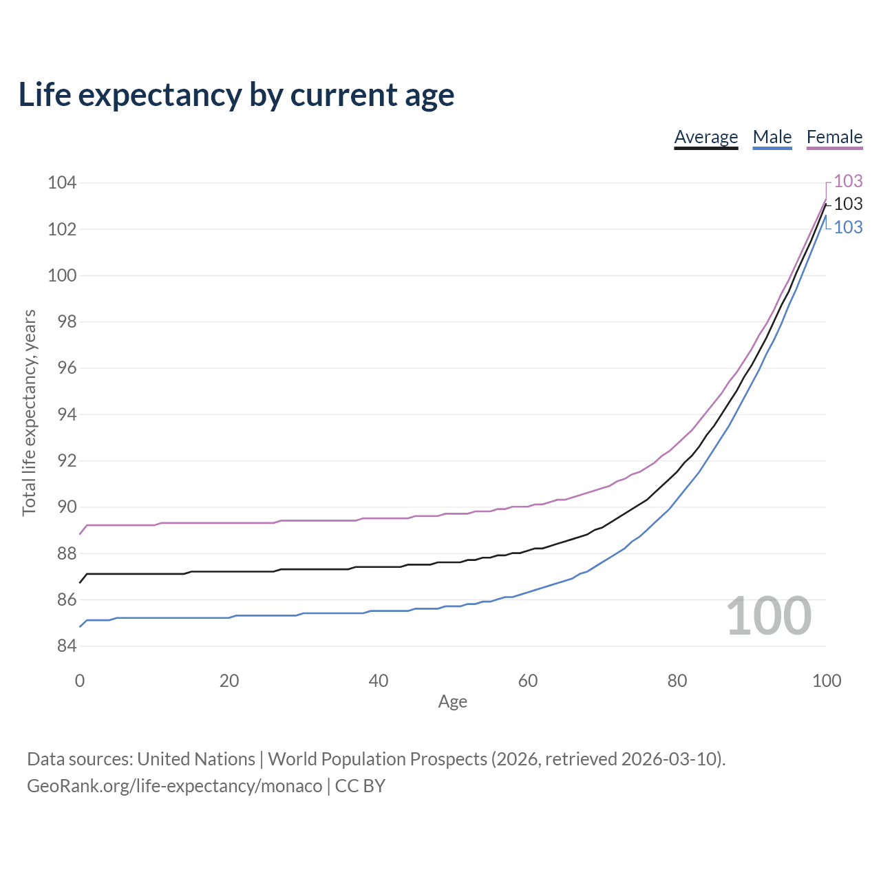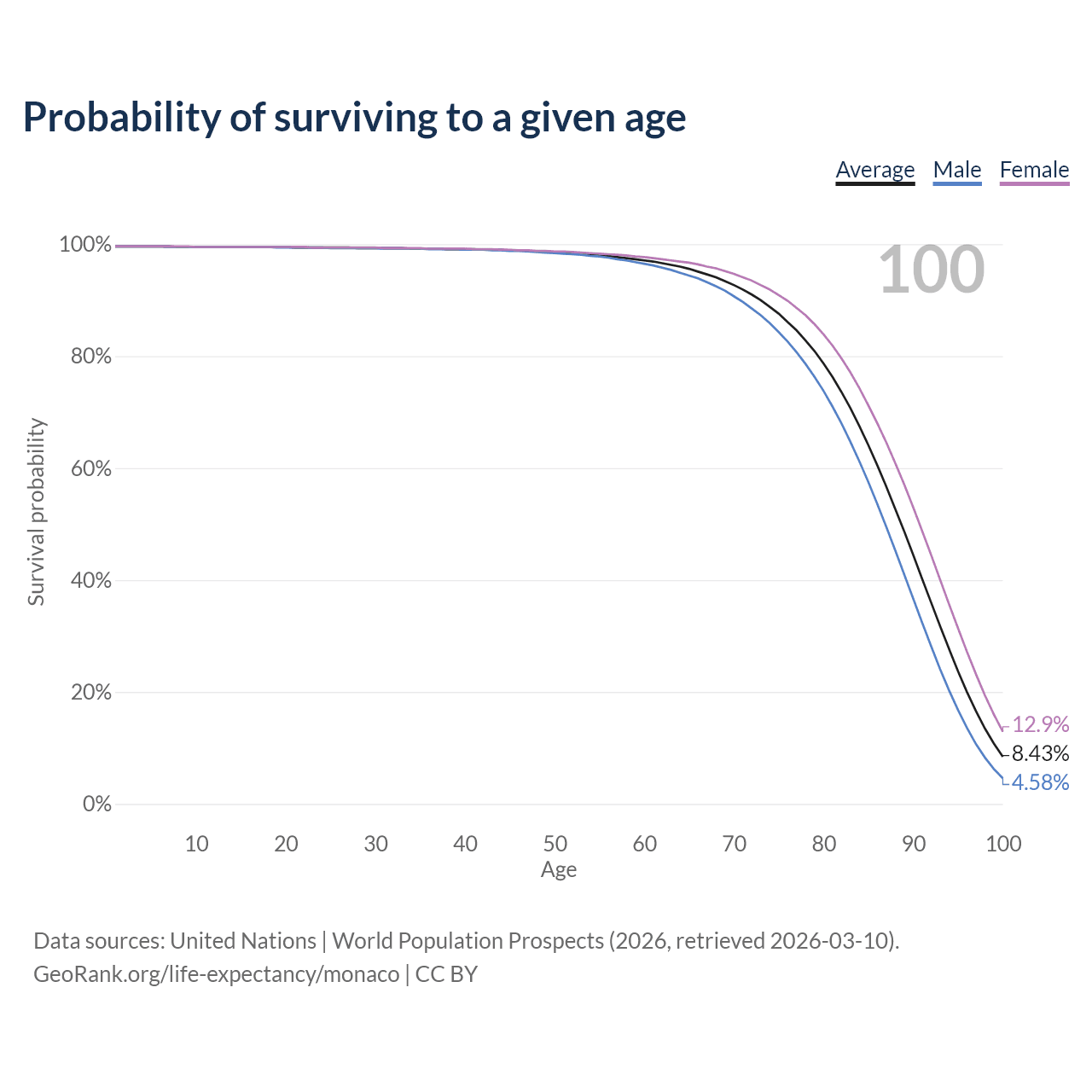 This life expectancy calculator shows the odds of living to 100, 95, 90, and below based on current age for both males and females in Monaco, along with mean and median age of death. The calculations are based on the 2026 life tables (actuarial tables) from the UN World Population Prospects.
