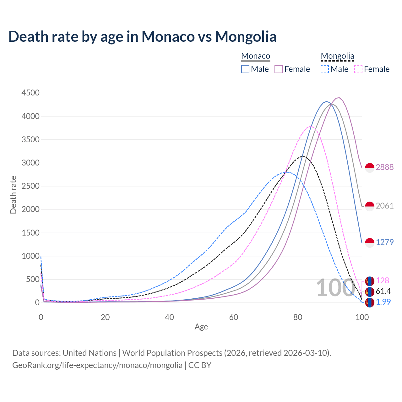 In Monaco, the most common age of death is 91, compared to 82 in Mongolia. The median age of death is 88.7 in Monaco and 76 in Mongolia, meaning only half of each cohort is expected to live past that age.
