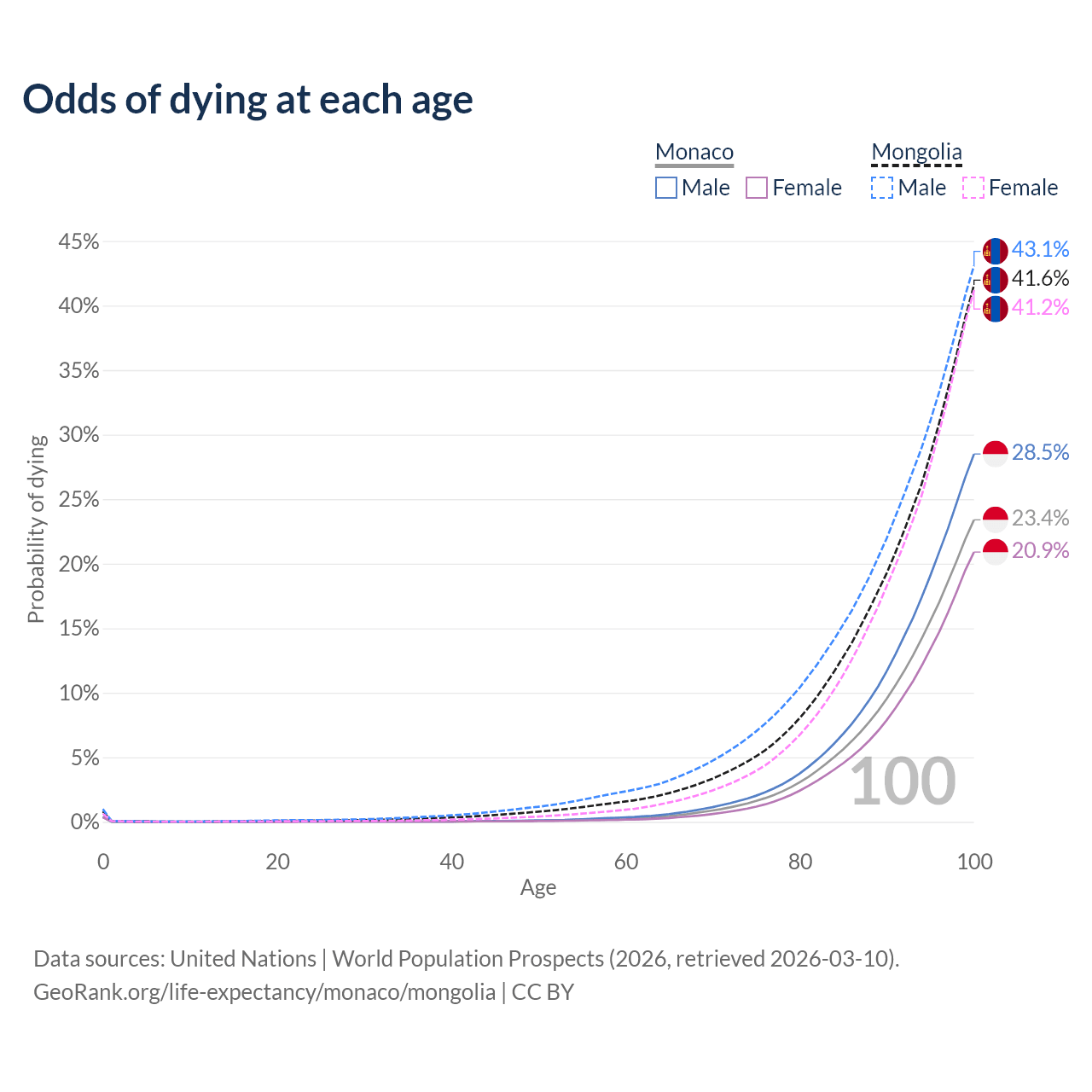 This life expectancy calculator shows the odds of living to 100, 95, 90, and below based on current age for both males and females in Monaco and Mongolia, along with mean and median age of death. The calculations are based on the 2026 life tables (actuarial tables) from the UN World Population Prospects.