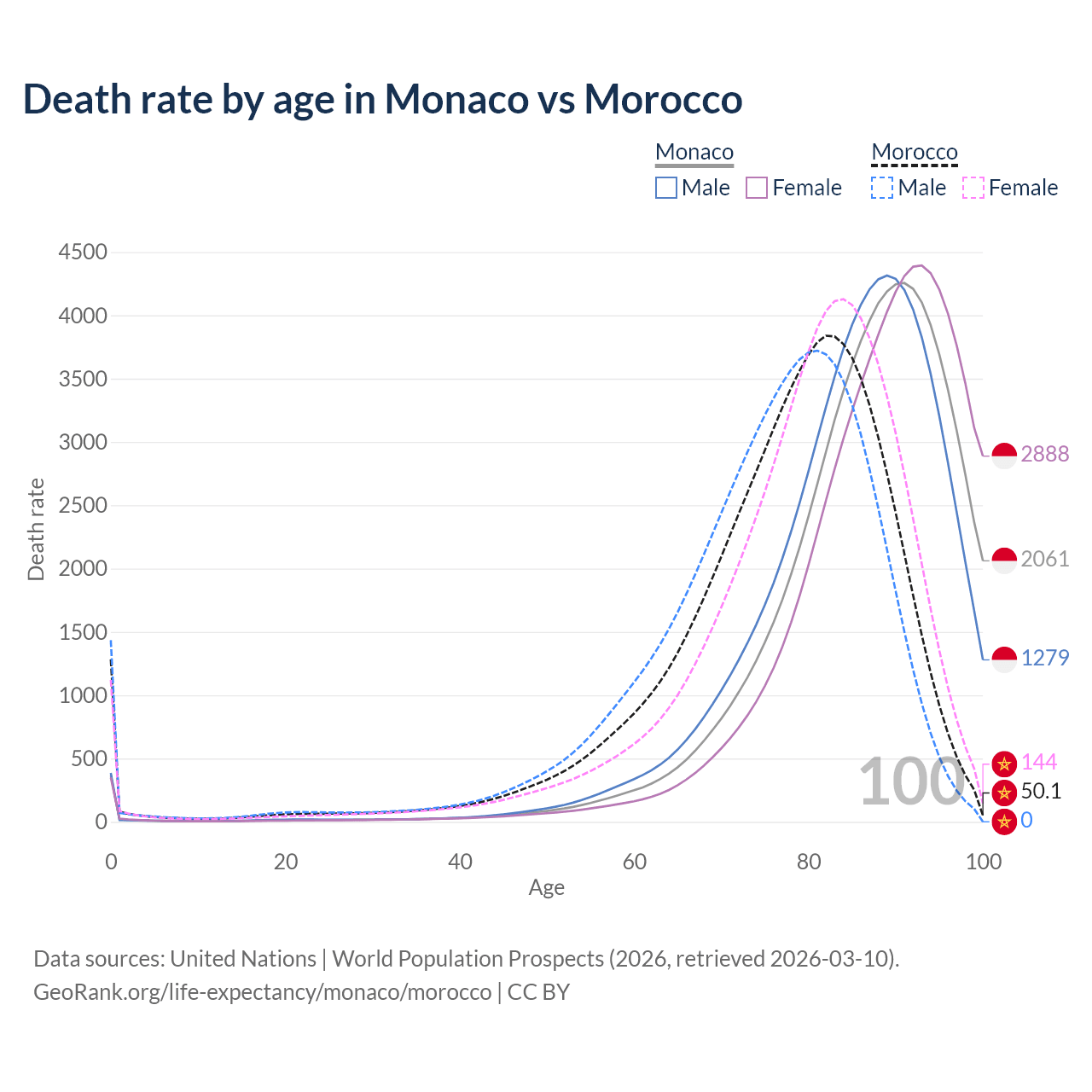 This life expectancy calculator shows the odds of living to 100, 95, 90, and below based on current age for both males and females in Monaco and Morocco, along with mean and median age of death. The calculations are based on the 2026 life tables (actuarial tables) from the UN World Population Prospects.
