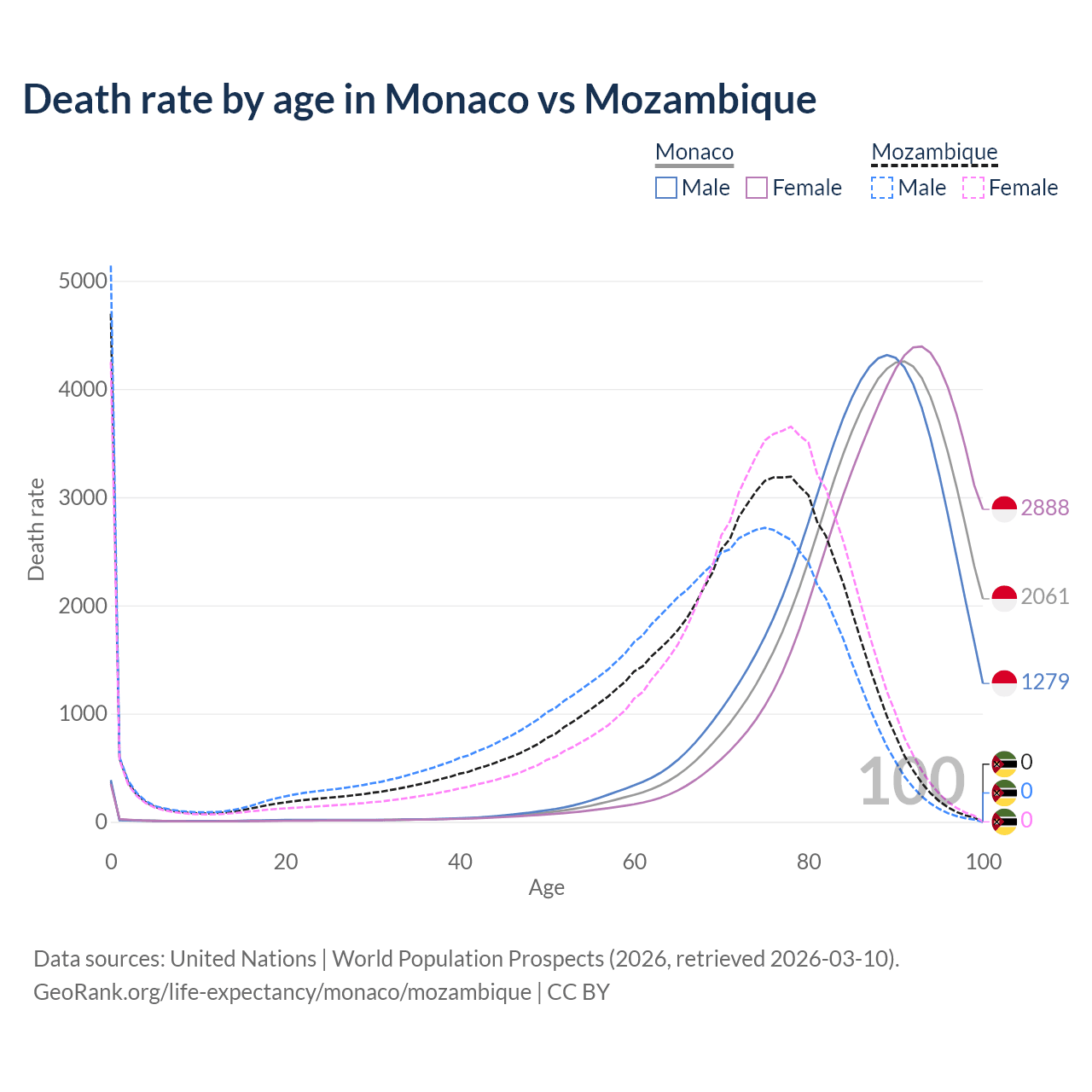 In Monaco, the most common age of death is 91, compared to 0 in Mozambique. The median age of death is 88.7 in Monaco and 71.2 in Mozambique, meaning only half of each cohort is expected to live past that age.