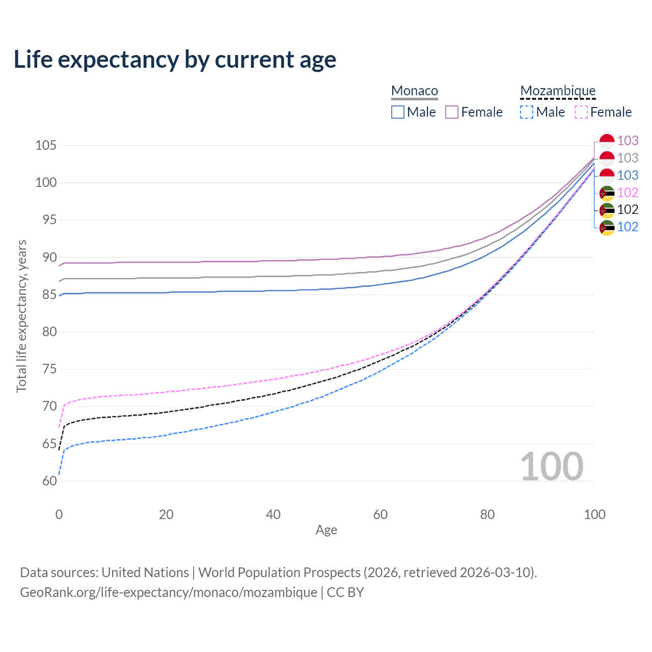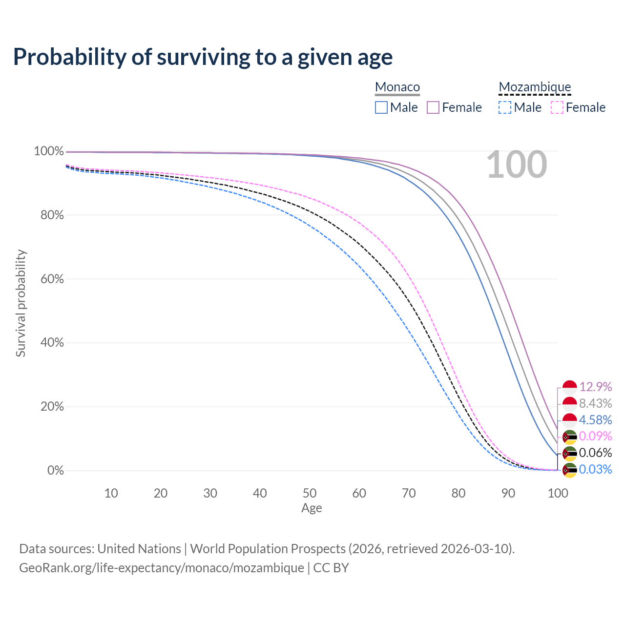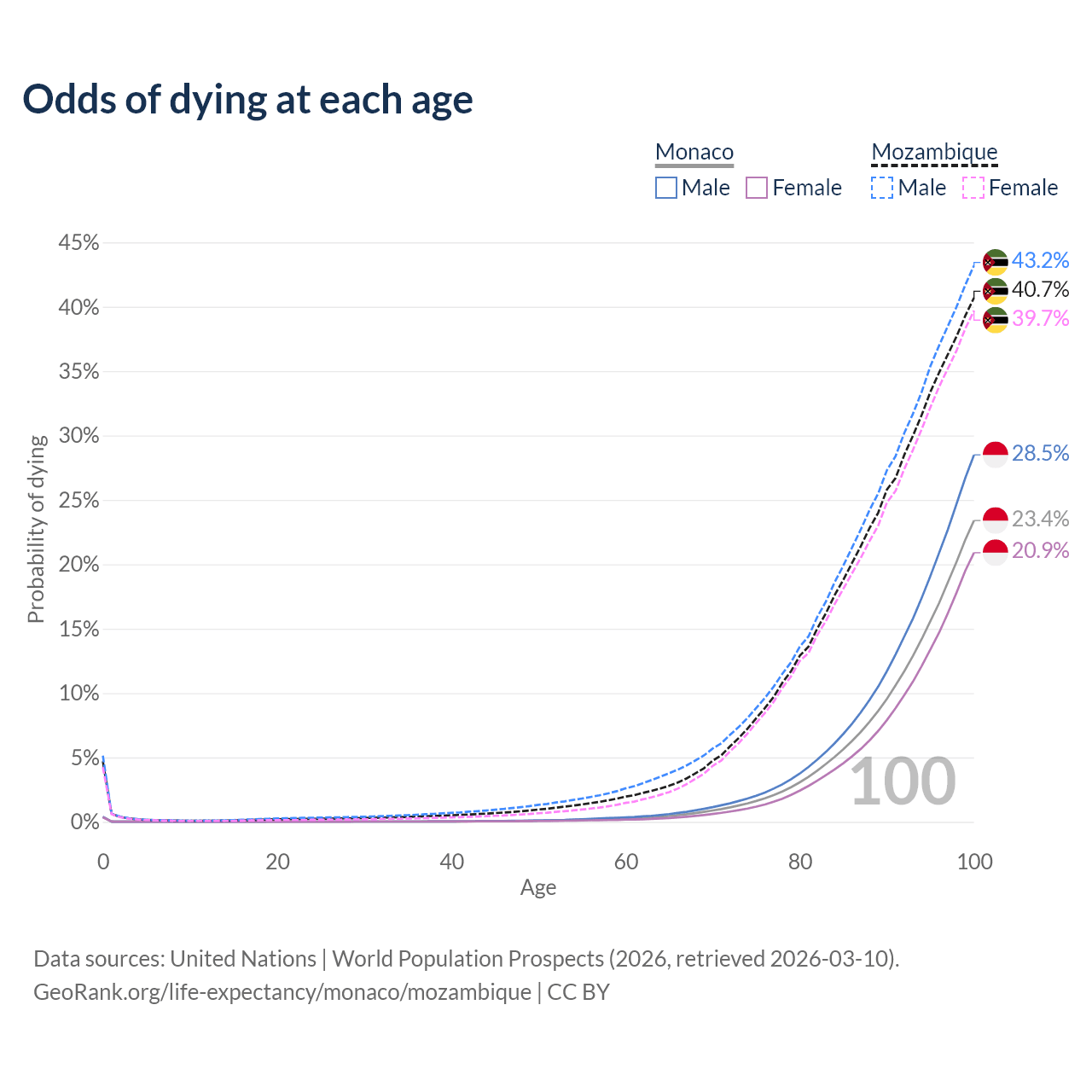 This life expectancy calculator shows the odds of living to 100, 95, 90, and below based on current age for both males and females in Monaco and Mozambique, along with mean and median age of death. The calculations are based on the 2026 life tables (actuarial tables) from the UN World Population Prospects.