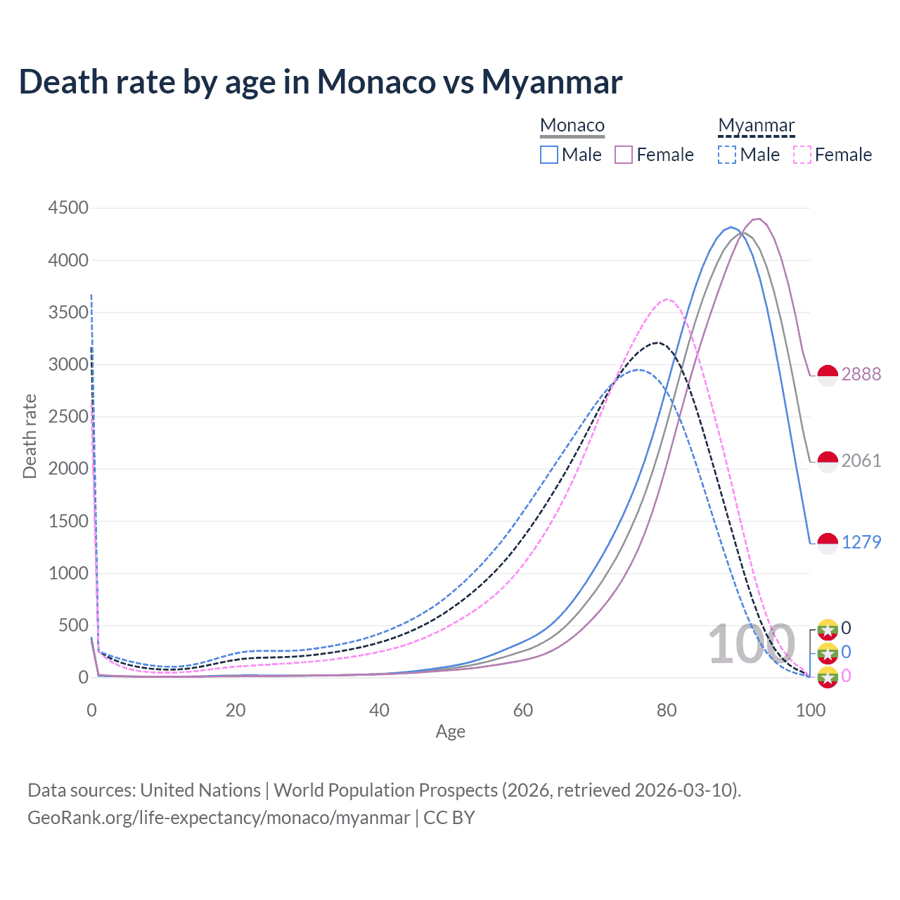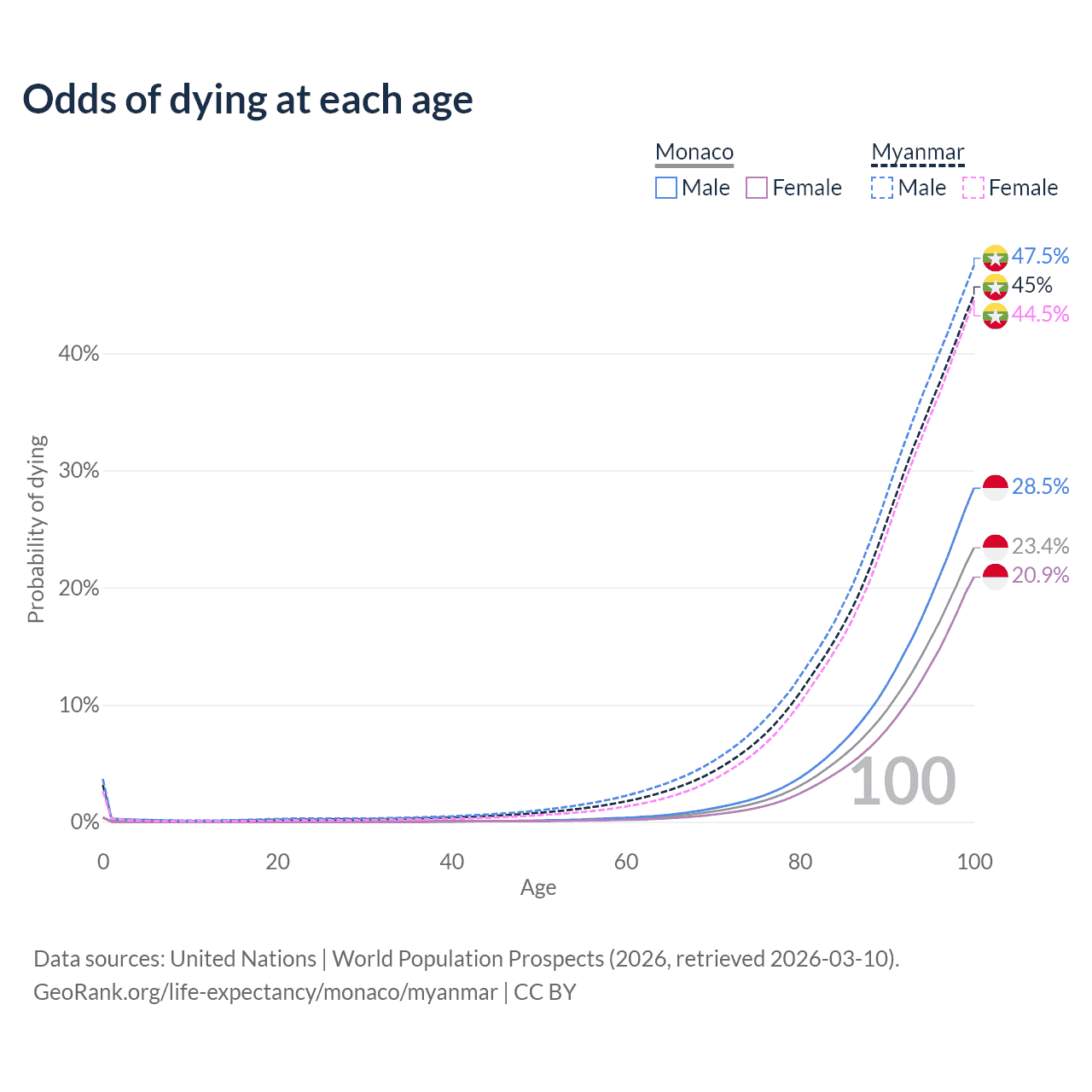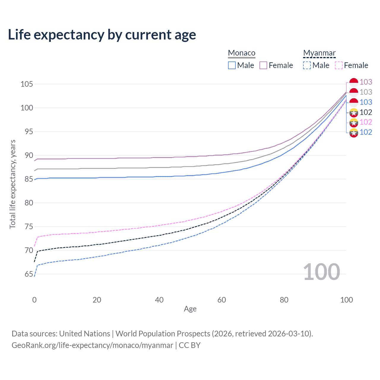 This life expectancy calculator shows the odds of living to 100, 95, 90, and below based on current age for both males and females in Monaco and Myanmar, along with mean and median age of death. The calculations are based on the 2026 life tables (actuarial tables) from the UN World Population Prospects.