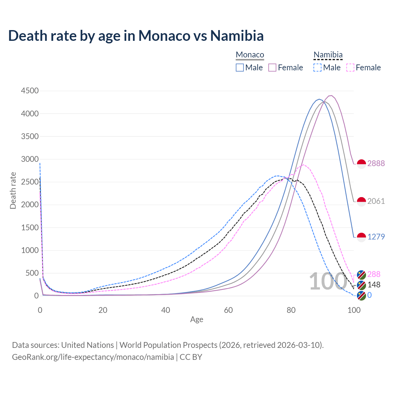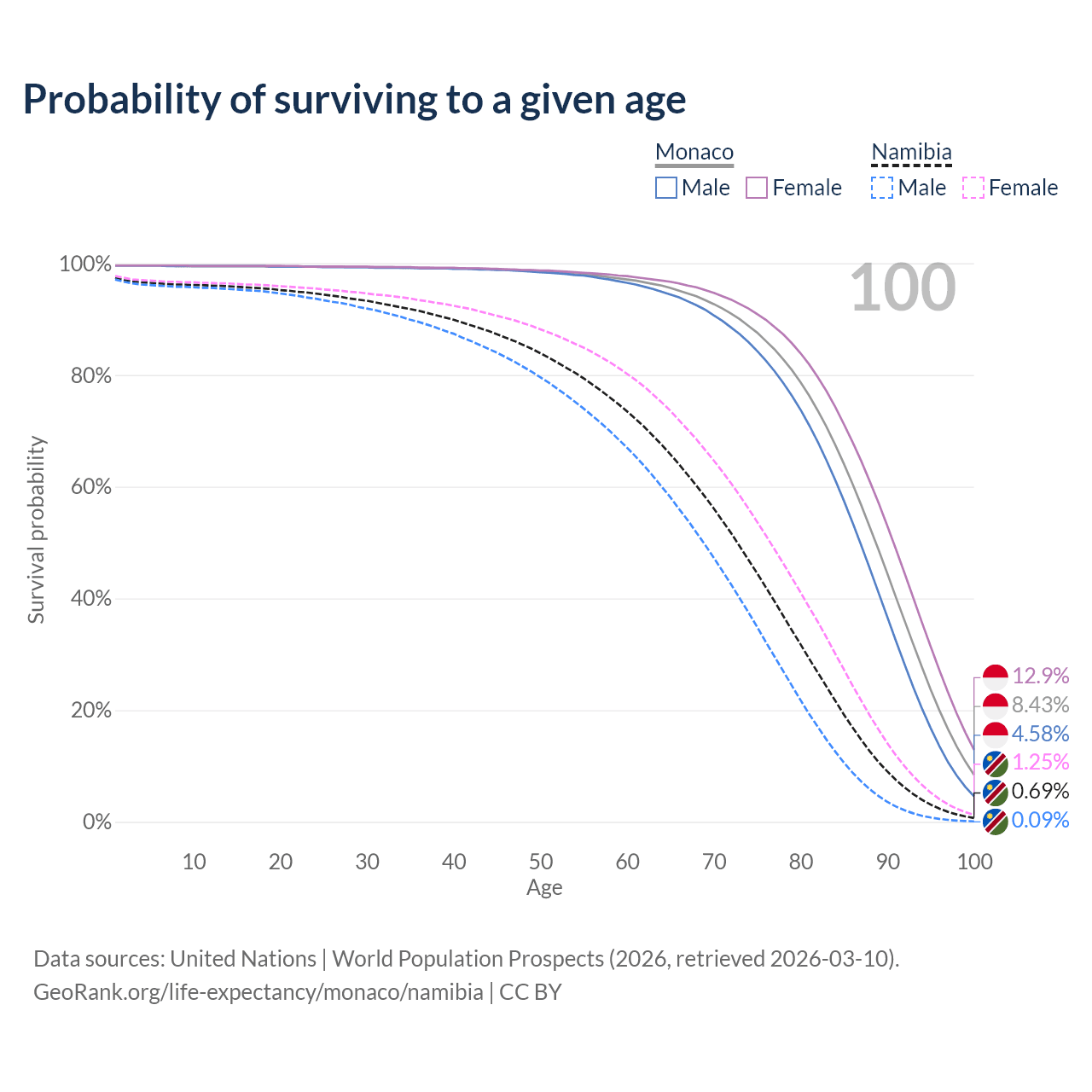 This life expectancy calculator shows the odds of living to 100, 95, 90, and below based on current age for both males and females in Monaco and Namibia, along with mean and median age of death. The calculations are based on the 2026 life tables (actuarial tables) from the UN World Population Prospects.