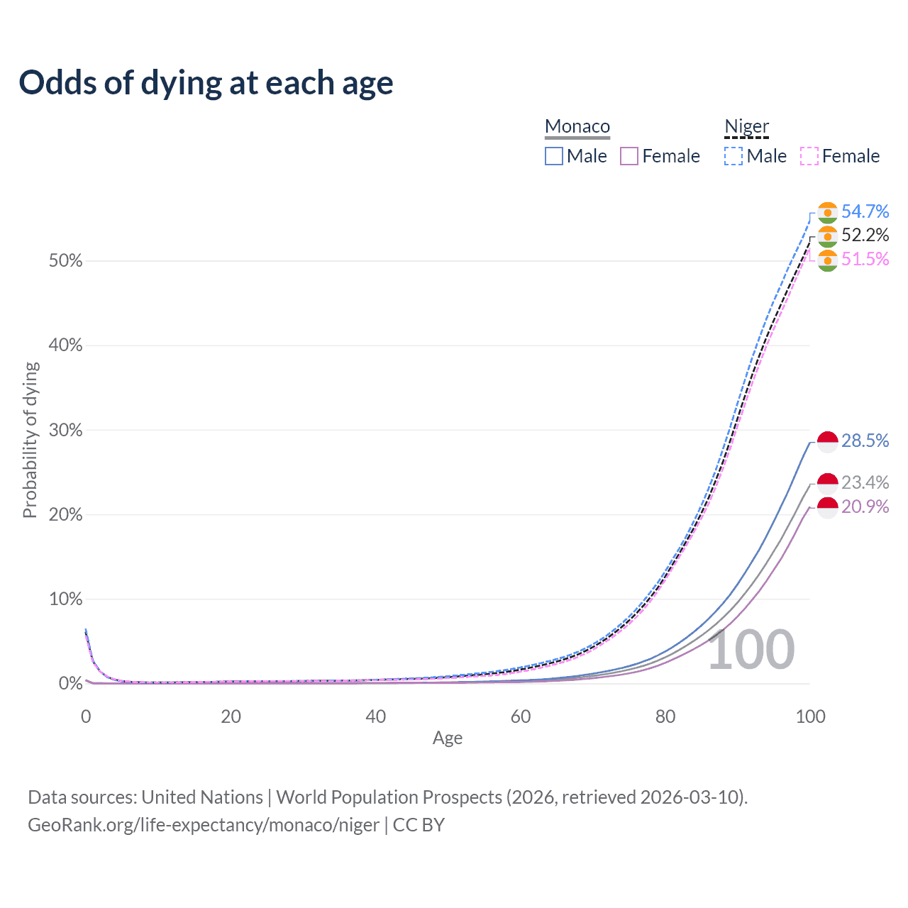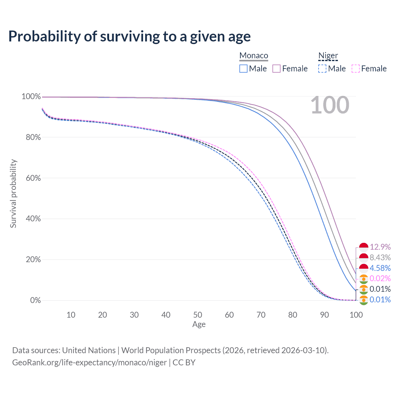 This life expectancy calculator shows the odds of living to 100, 95, 90, and below based on current age for both males and females in Monaco and Niger, along with mean and median age of death. The calculations are based on the 2026 life tables (actuarial tables) from the UN World Population Prospects.
