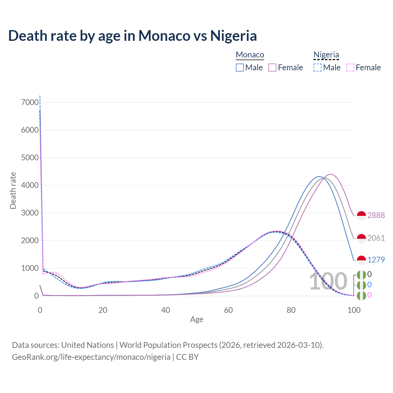 In Monaco, the most common age of death is 91, compared to 0 in Nigeria. The median age of death is 88.7 in Monaco and 64.3 in Nigeria, meaning only half of each cohort is expected to live past that age.