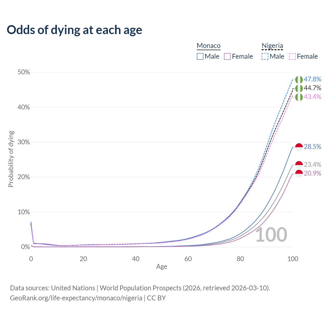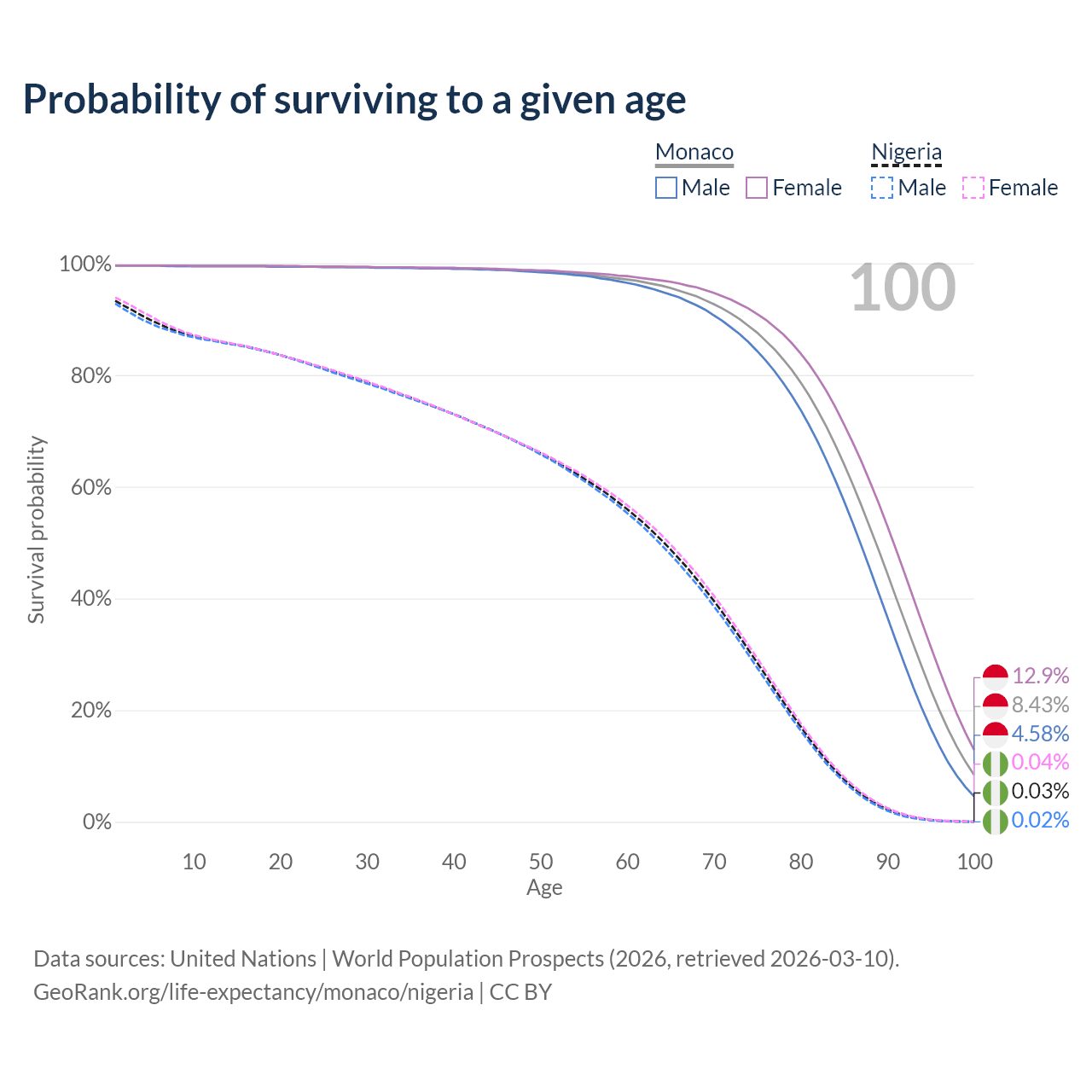 This life expectancy calculator shows the odds of living to 100, 95, 90, and below based on current age for both males and females in Monaco and Nigeria, along with mean and median age of death. The calculations are based on the 2026 life tables (actuarial tables) from the UN World Population Prospects.