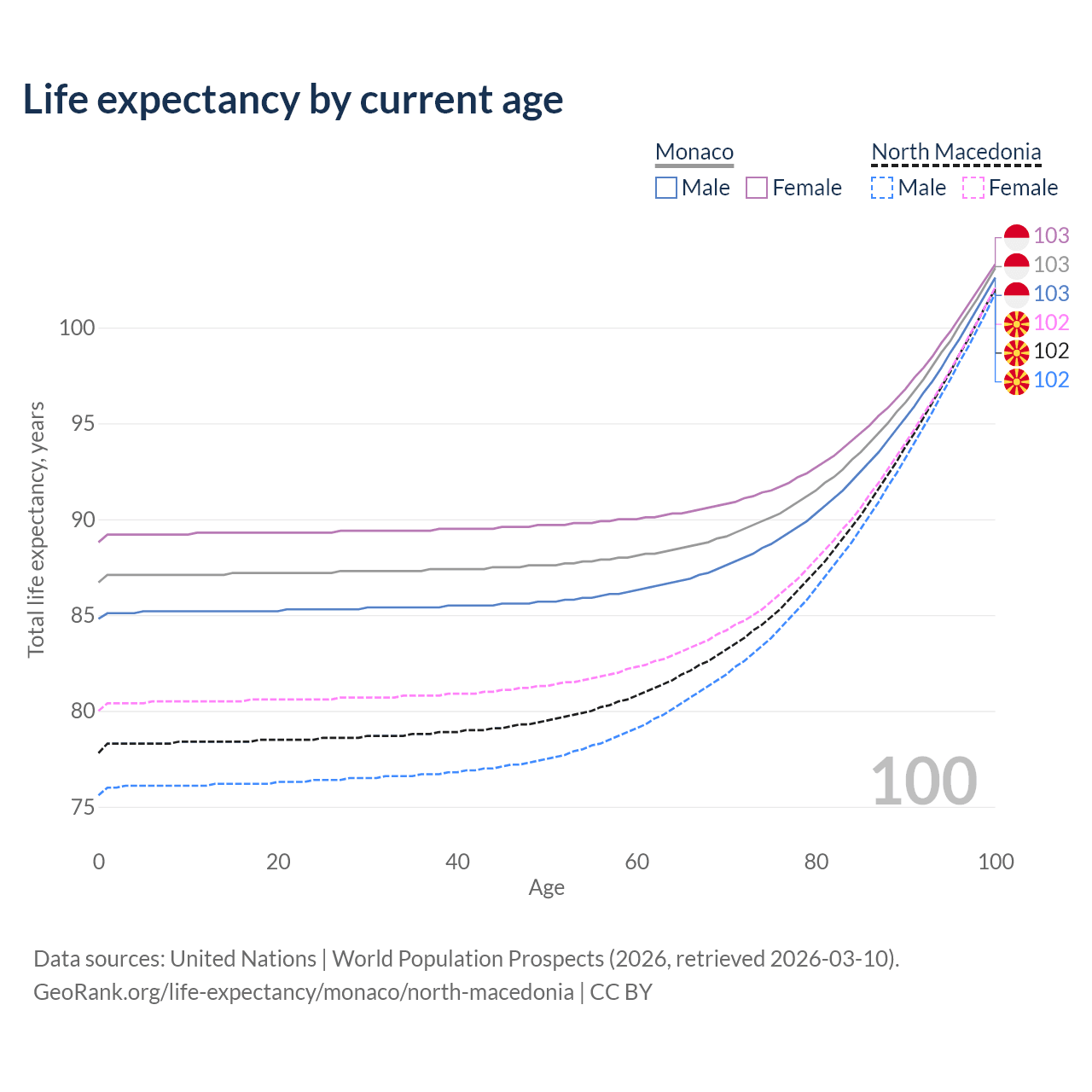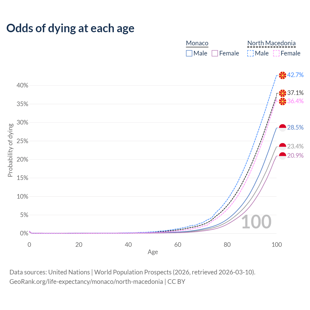 This life expectancy calculator shows the odds of living to 100, 95, 90, and below based on current age for both males and females in Monaco and North Macedonia, along with mean and median age of death. The calculations are based on the 2026 life tables (actuarial tables) from the UN World Population Prospects.