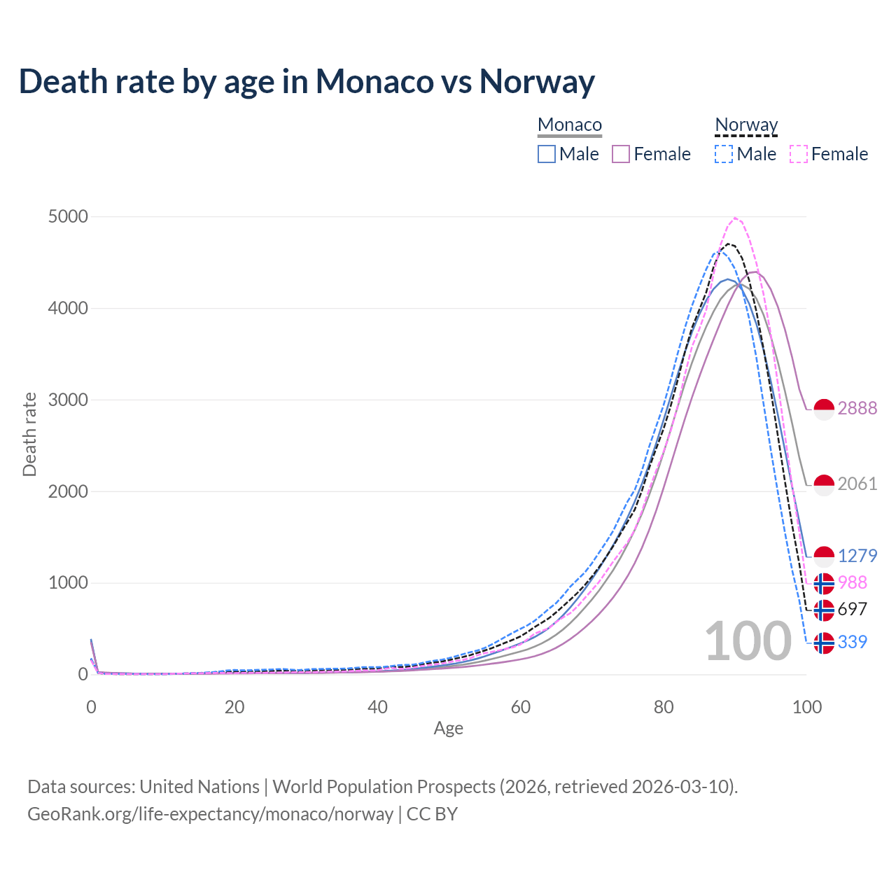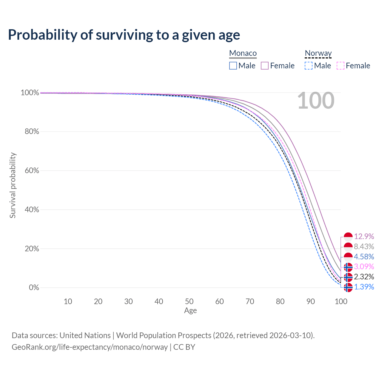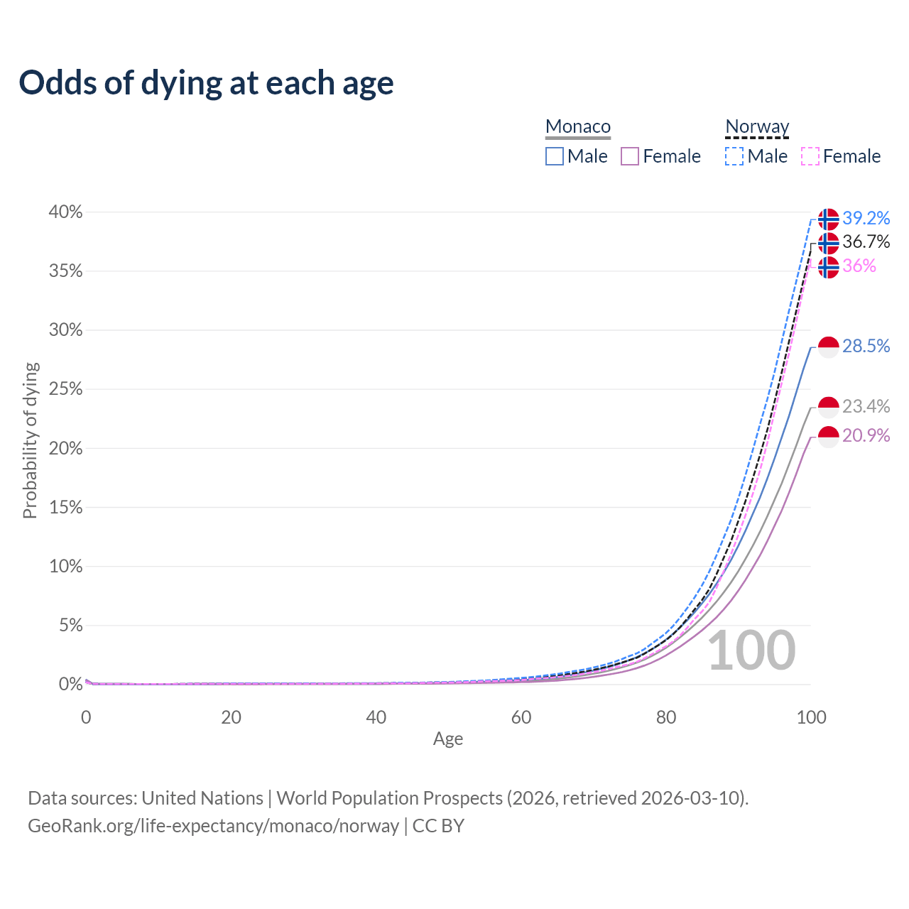 This life expectancy calculator shows the odds of living to 100, 95, 90, and below based on current age for both males and females in Monaco and Norway, along with mean and median age of death. The calculations are based on the 2026 life tables (actuarial tables) from the UN World Population Prospects.