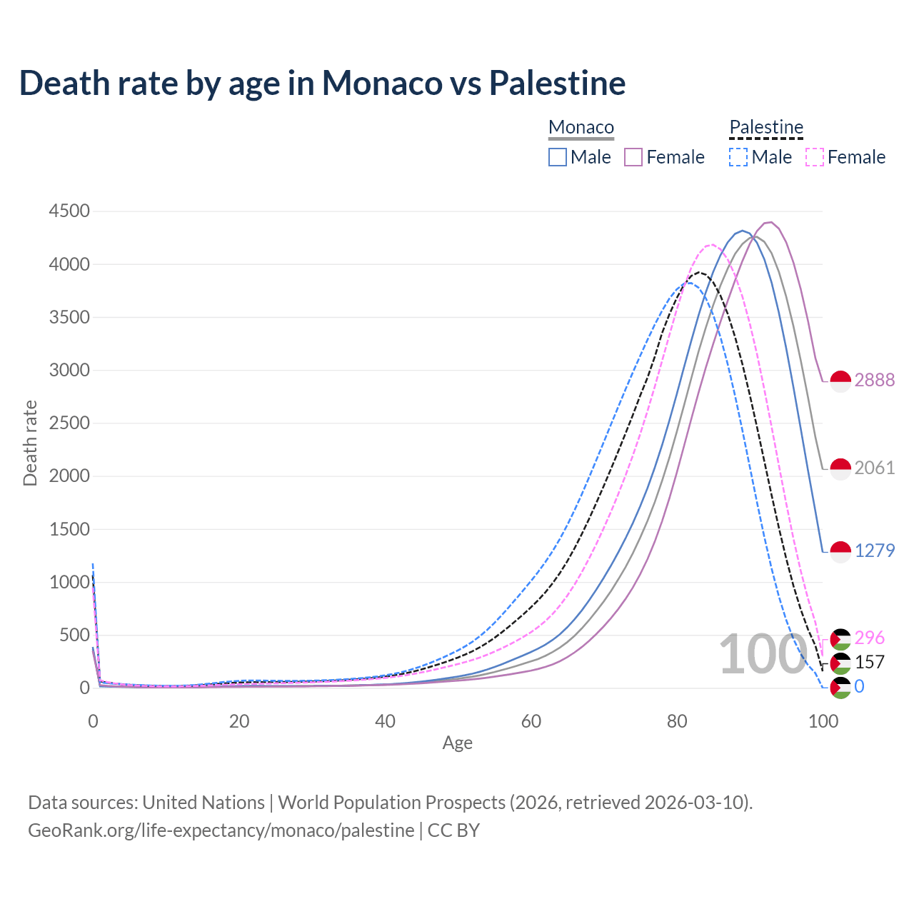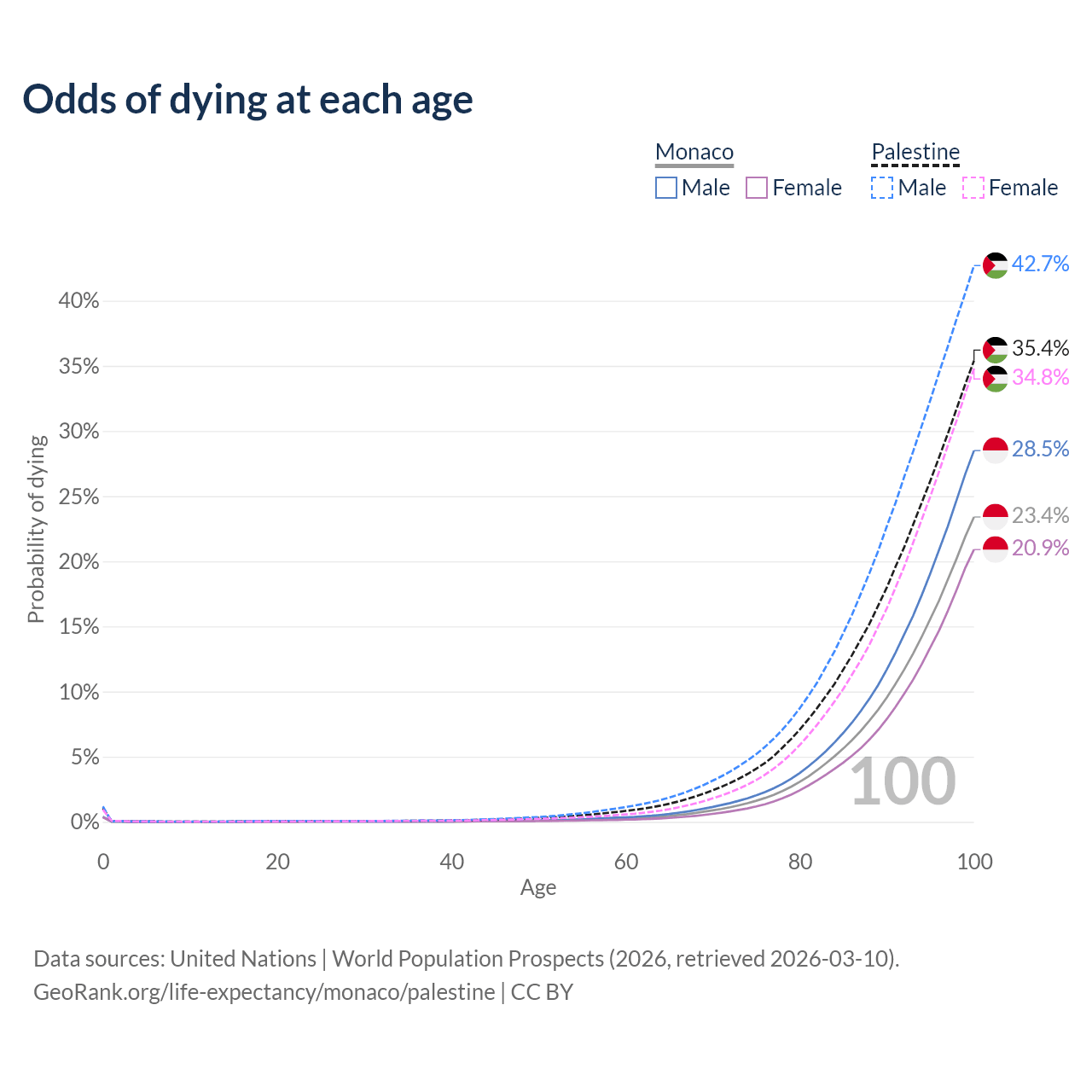 This life expectancy calculator shows the odds of living to 100, 95, 90, and below based on current age for both males and females in Monaco and Palestine, along with mean and median age of death. The calculations are based on the 2026 life tables (actuarial tables) from the UN World Population Prospects.