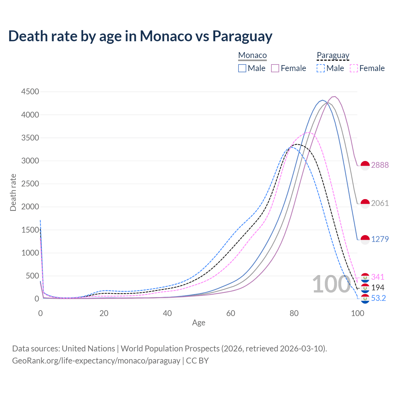 In Monaco, the most common age of death is 91, compared to 81 in Paraguay. The median age of death is 88.7 in Monaco and 78.4 in Paraguay, meaning only half of each cohort is expected to live past that age.