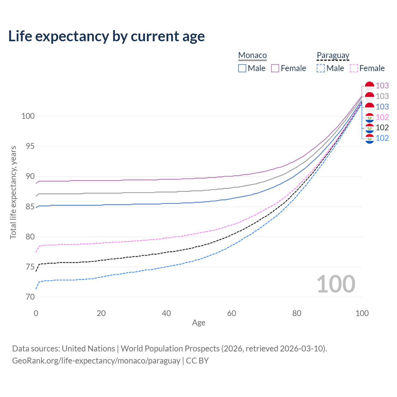This life expectancy calculator shows the odds of living to 100, 95, 90, and below based on current age for both males and females in Monaco and Paraguay, along with mean and median age of death. The calculations are based on the 2026 life tables (actuarial tables) from the UN World Population Prospects.