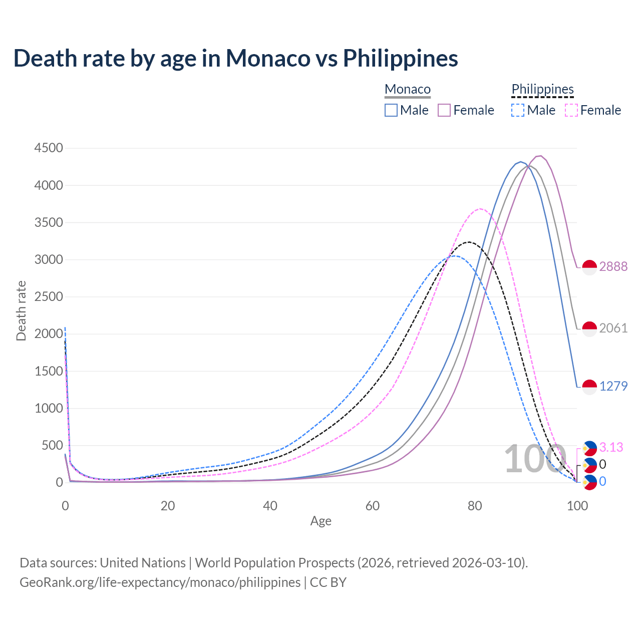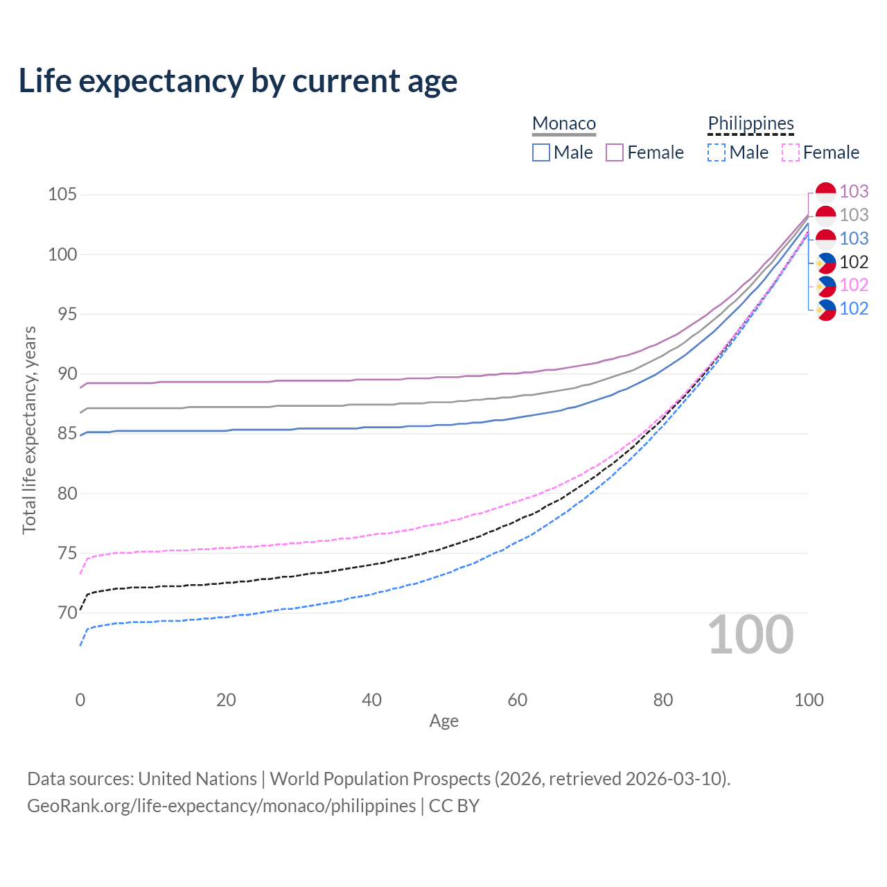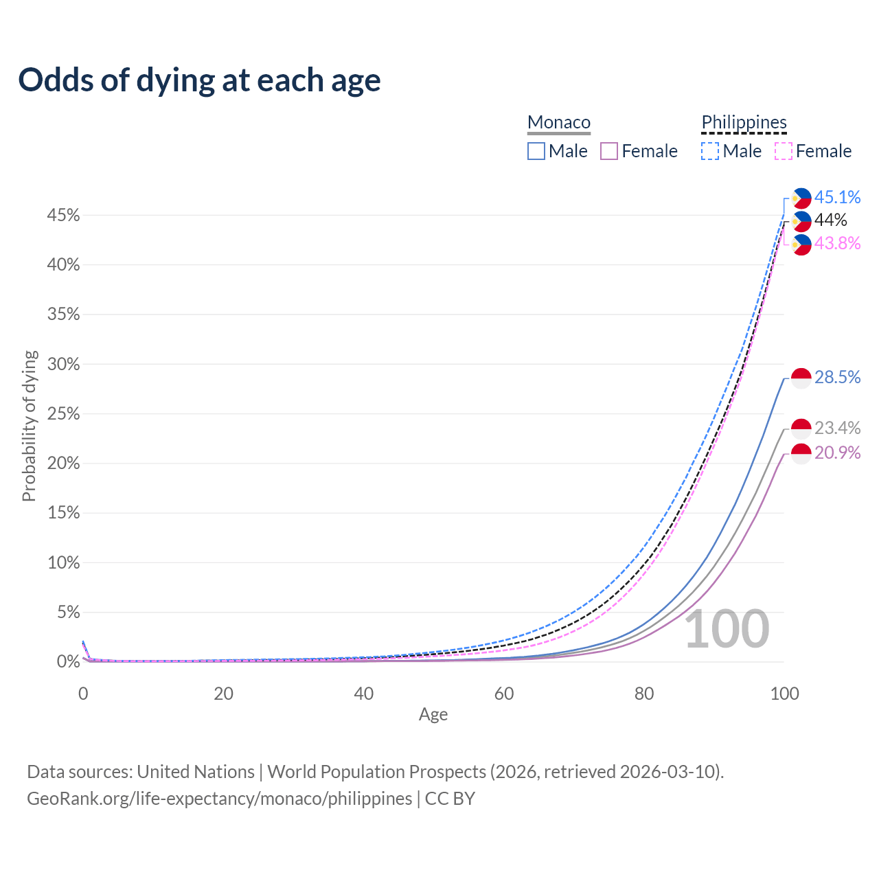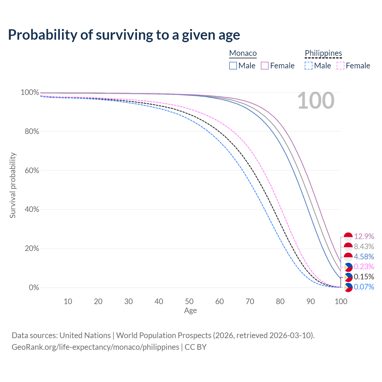 This life expectancy calculator shows the odds of living to 100, 95, 90, and below based on current age for both males and females in Monaco and the Philippines, along with mean and median age of death. The calculations are based on the 2026 life tables (actuarial tables) from the UN World Population Prospects.