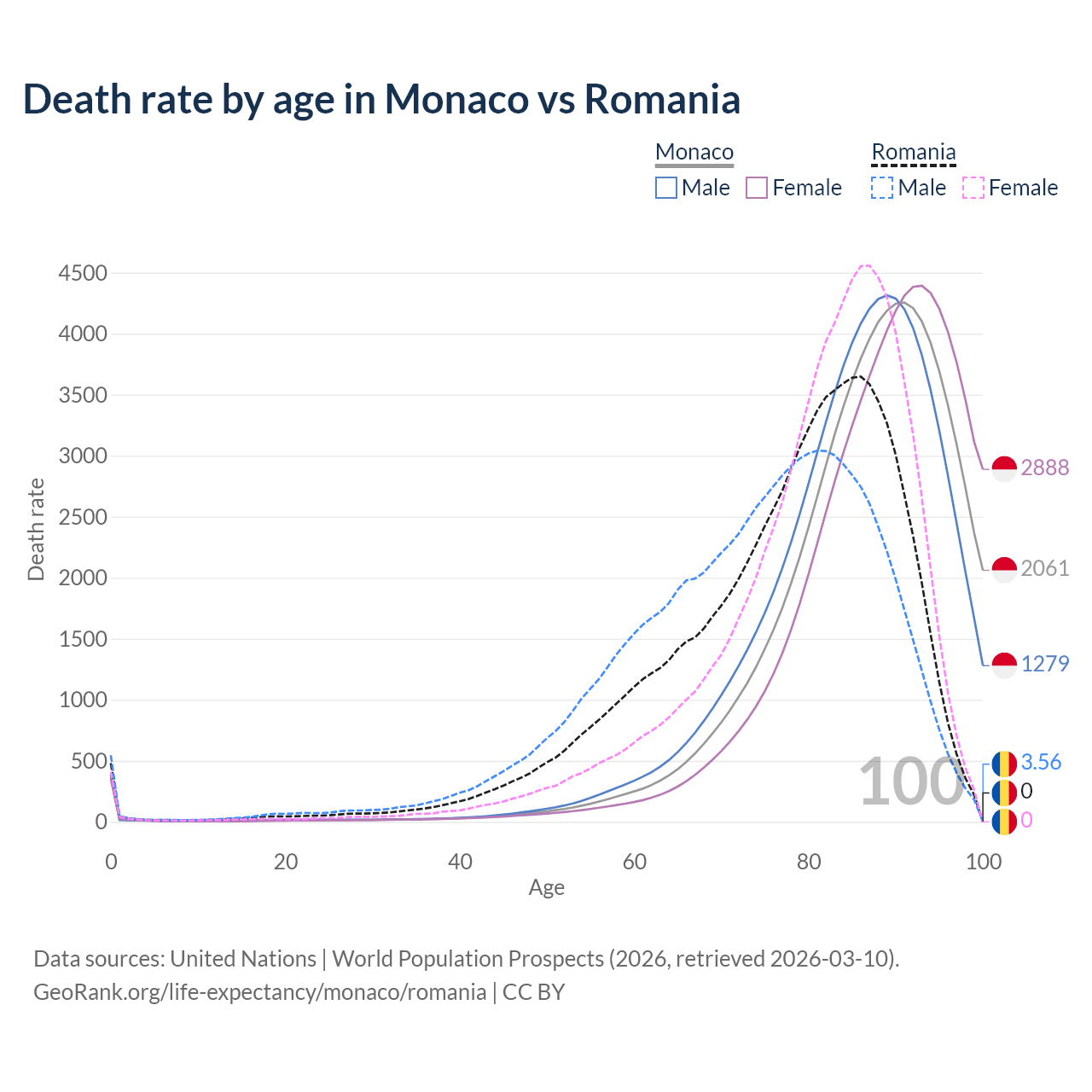 In Monaco, the most common age of death is 91, compared to 86 in Romania. The median age of death is 88.7 in Monaco and 79.9 in Romania, meaning only half of each cohort is expected to live past that age.