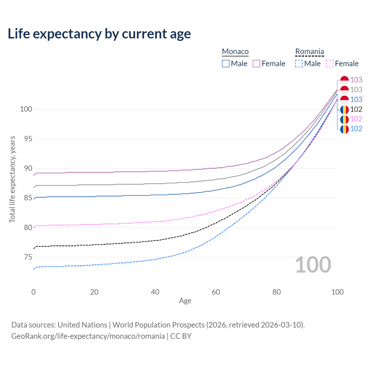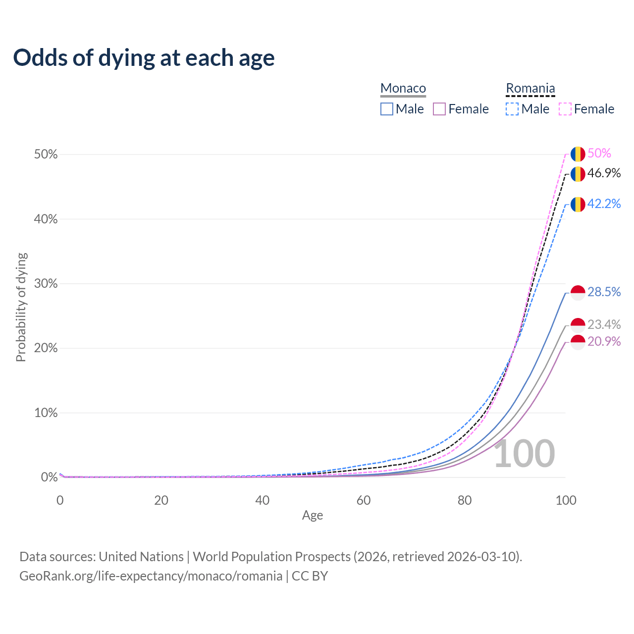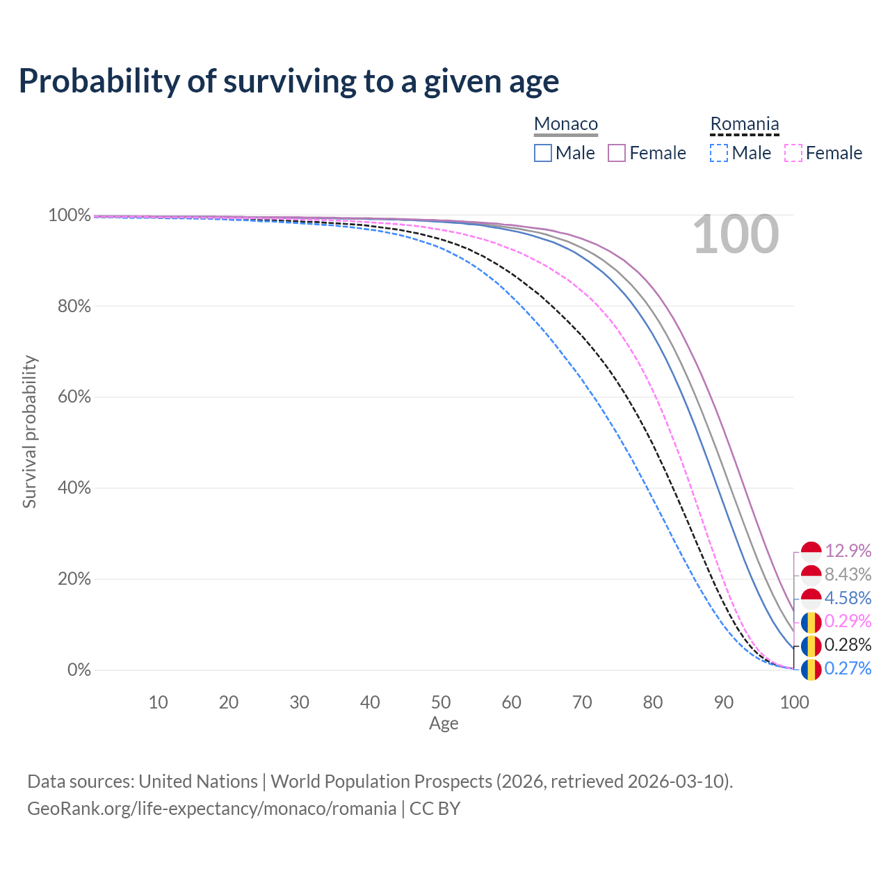 This life expectancy calculator shows the odds of living to 100, 95, 90, and below based on current age for both males and females in Monaco and Romania, along with mean and median age of death. The calculations are based on the 2026 life tables (actuarial tables) from the UN World Population Prospects.