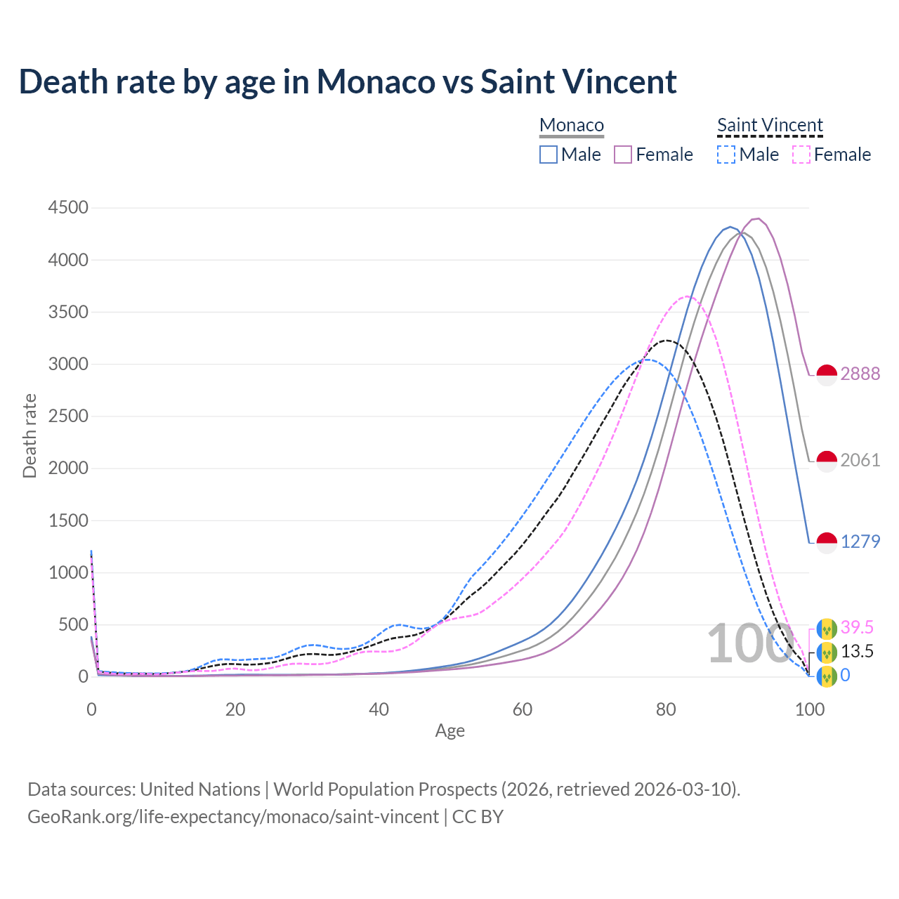 In Monaco, the most common age of death is 91, compared to 80 in Saint Vincent. The median age of death is 88.7 in Monaco and 75.6 in Saint Vincent, meaning only half of each cohort is expected to live past that age.