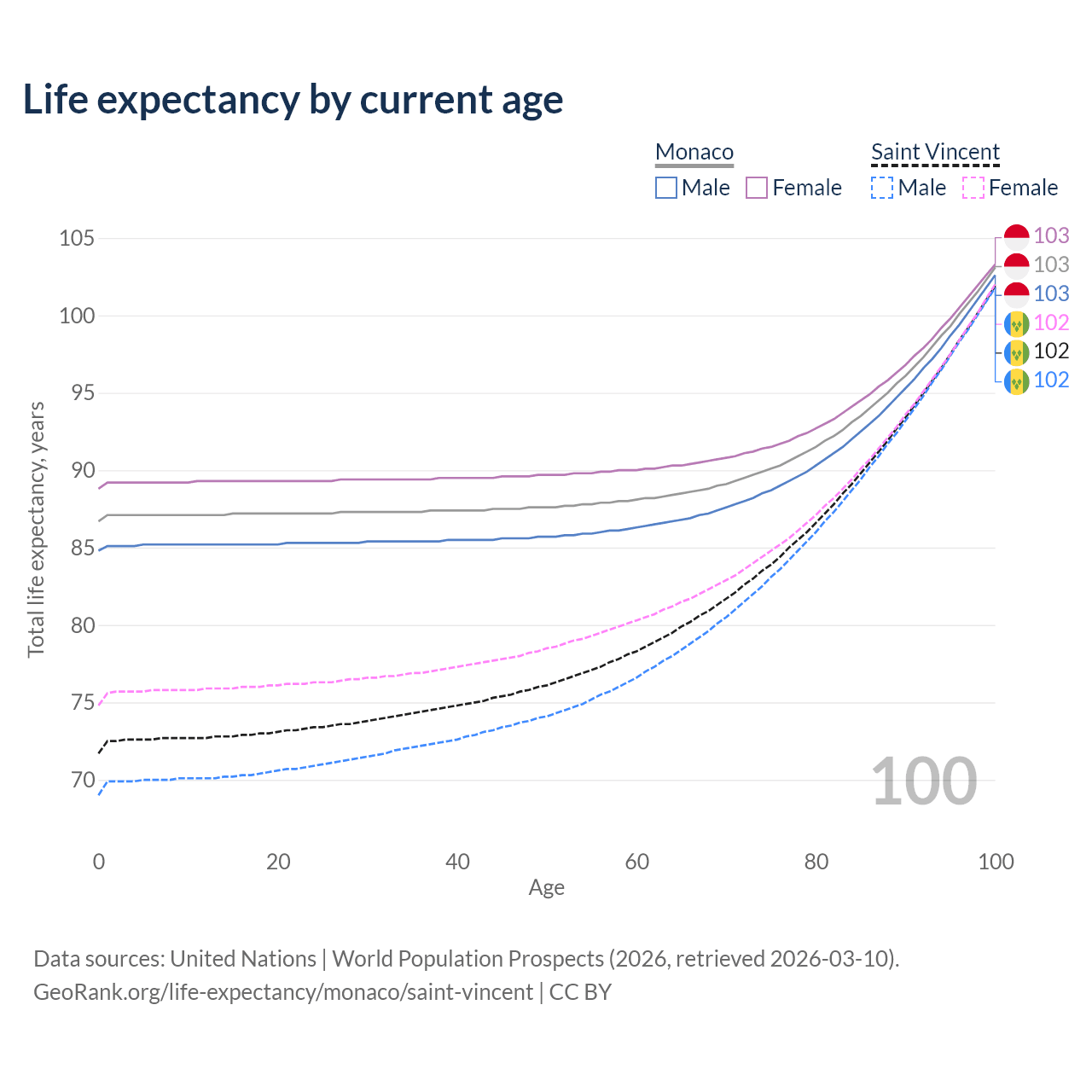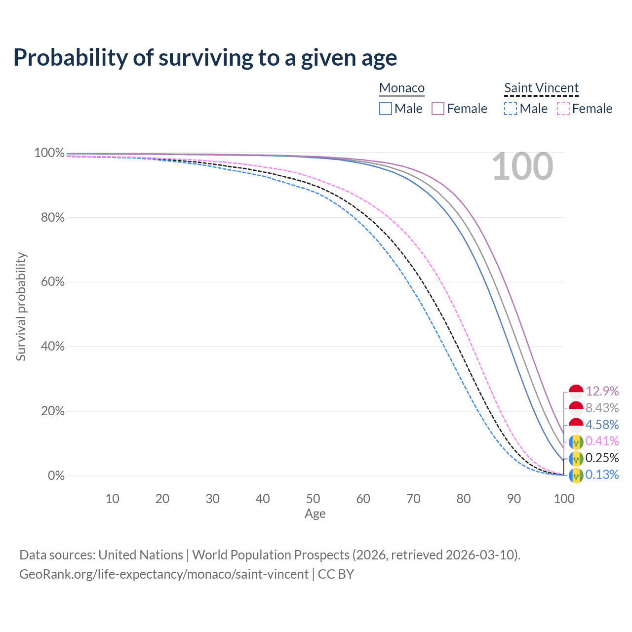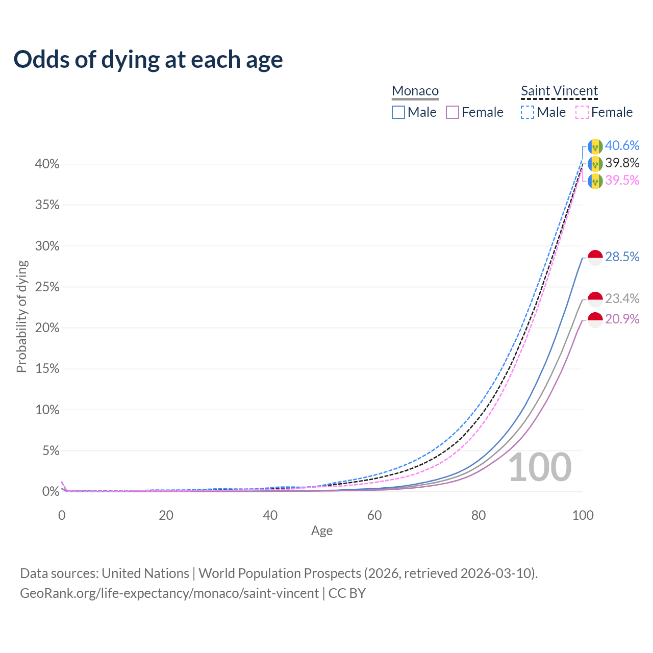 This life expectancy calculator shows the odds of living to 100, 95, 90, and below based on current age for both males and females in Monaco and Saint Vincent, along with mean and median age of death. The calculations are based on the 2026 life tables (actuarial tables) from the UN World Population Prospects.