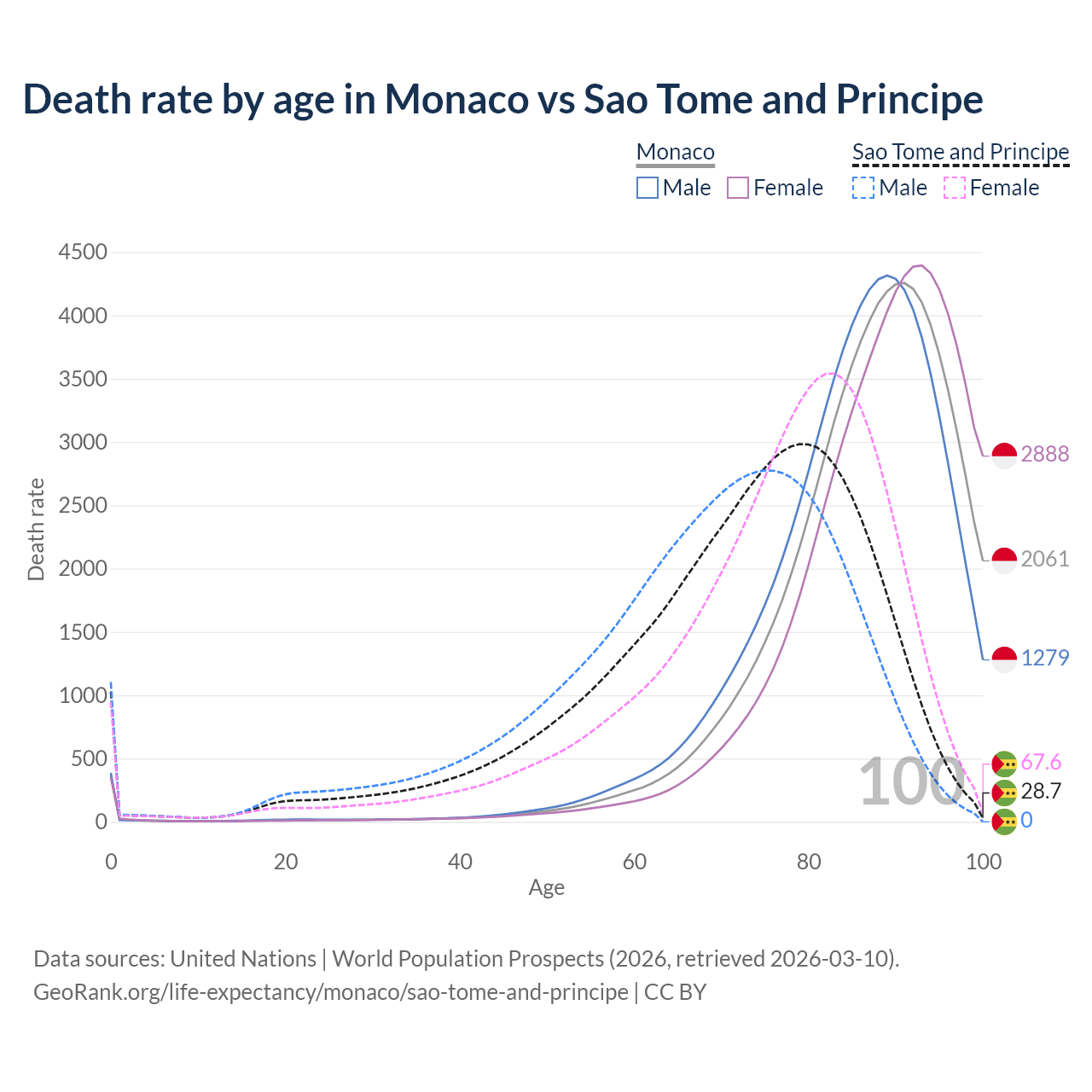 In Monaco, the most common age of death is 91, compared to 79 in Sao Tome and Principe. The median age of death is 88.7 in Monaco and 74.1 in Sao Tome and Principe, meaning only half of each cohort is expected to live past that age.