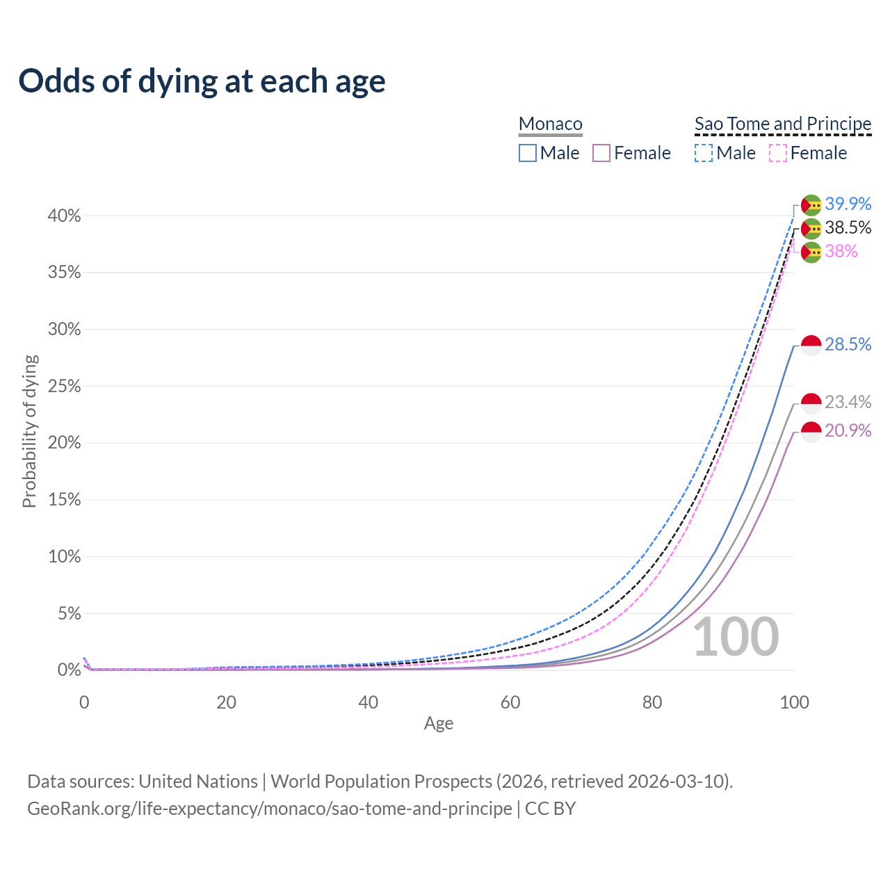 This life expectancy calculator shows the odds of living to 100, 95, 90, and below based on current age for both males and females in Monaco and Sao Tome and Principe, along with mean and median age of death. The calculations are based on the 2026 life tables (actuarial tables) from the UN World Population Prospects.