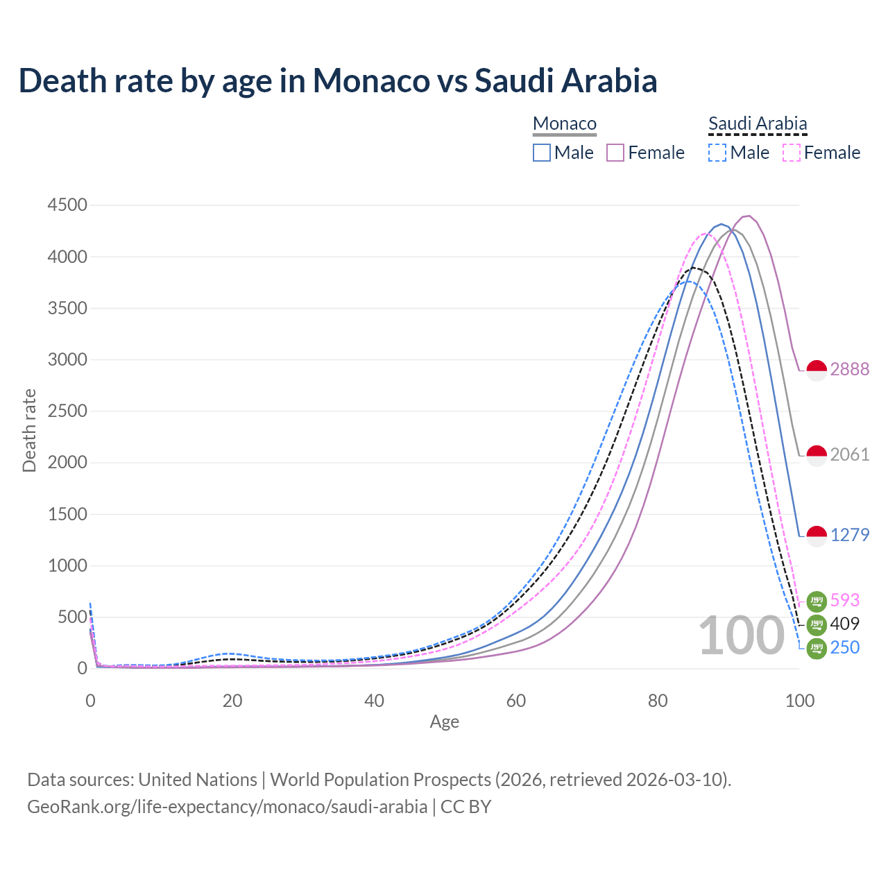 In Monaco, the most common age of death is 91, compared to 85 in Saudi Arabia. The median age of death is 88.7 in Monaco and 82.5 in Saudi Arabia, meaning only half of each cohort is expected to live past that age.