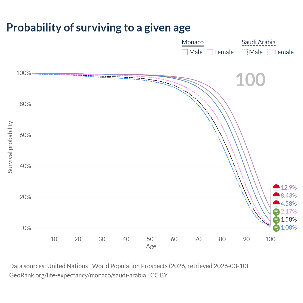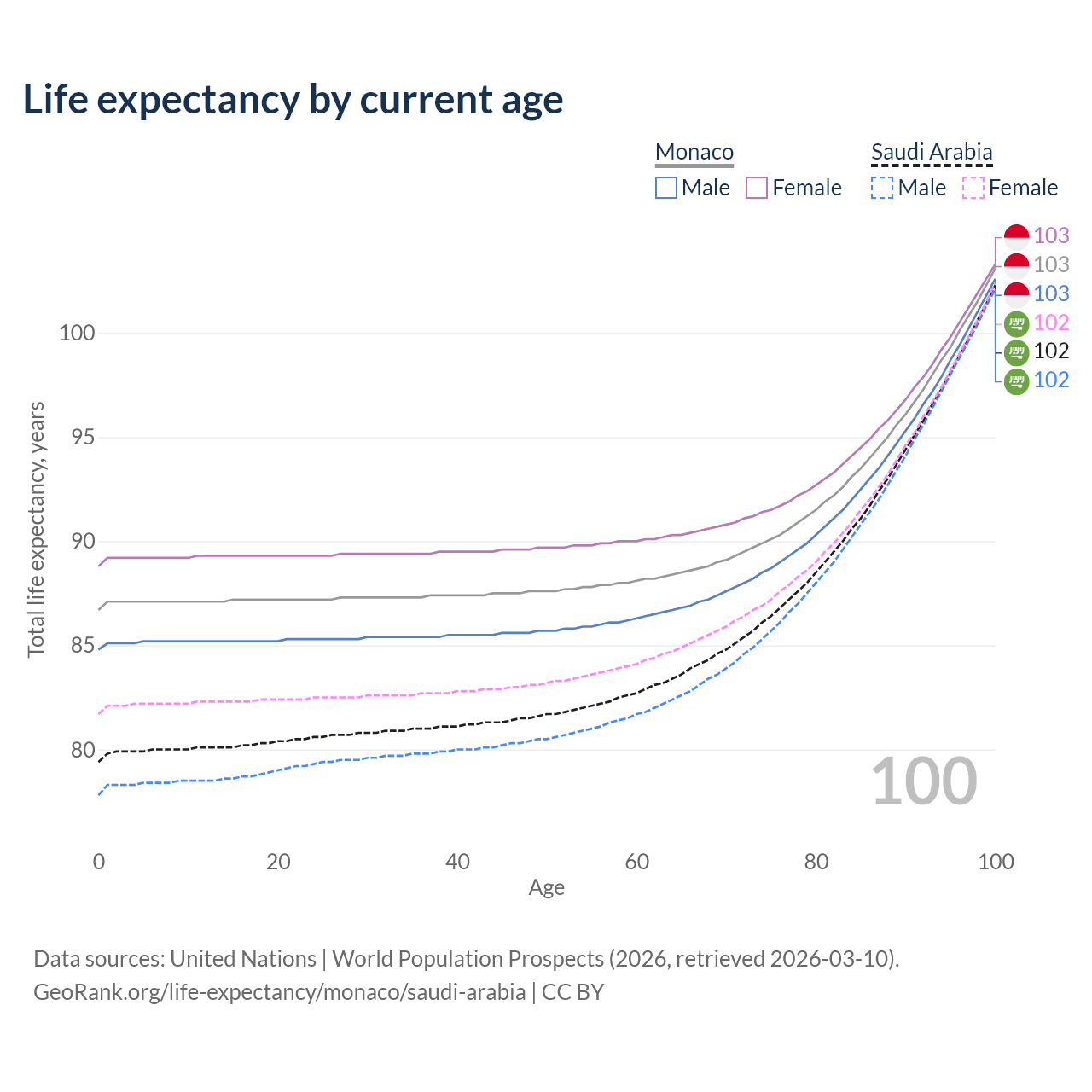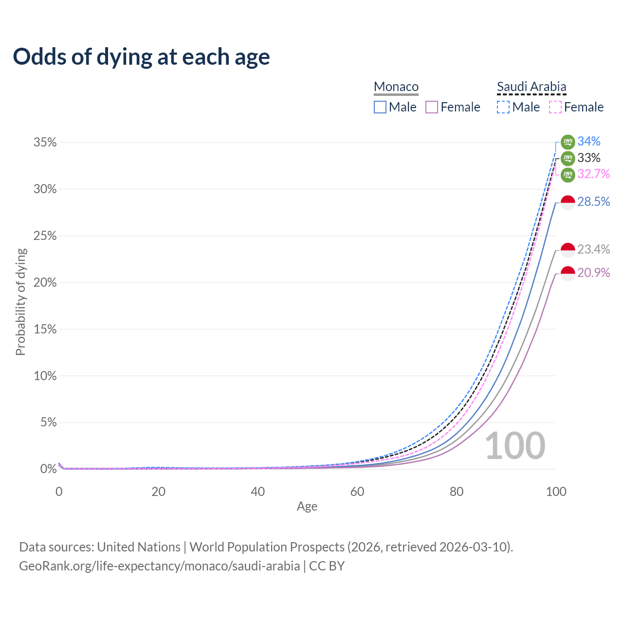 This life expectancy calculator shows the odds of living to 100, 95, 90, and below based on current age for both males and females in Monaco and Saudi Arabia, along with mean and median age of death. The calculations are based on the 2026 life tables (actuarial tables) from the UN World Population Prospects.