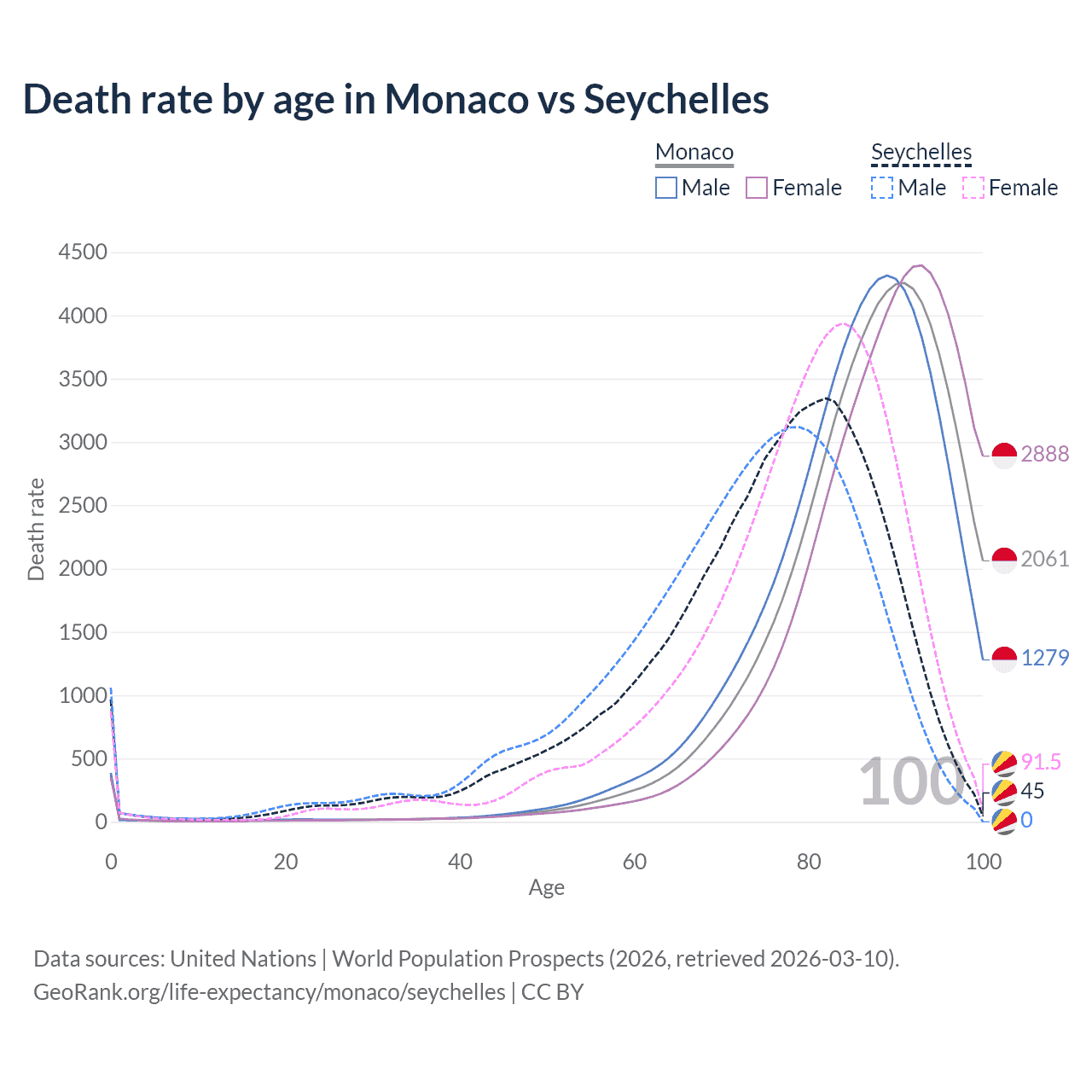 In Monaco, the most common age of death is 91, compared to 82 in the Seychelles. The median age of death is 88.7 in Monaco and 77 in the Seychelles, meaning only half of each cohort is expected to live past that age.