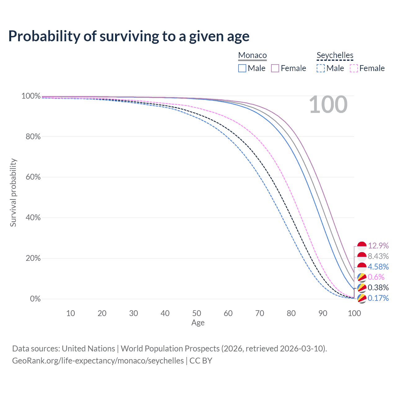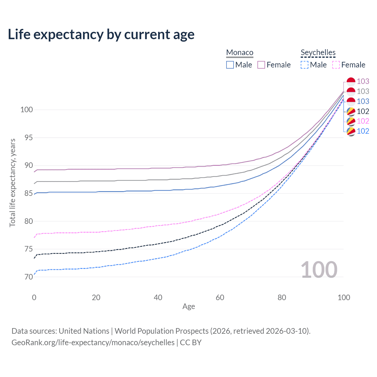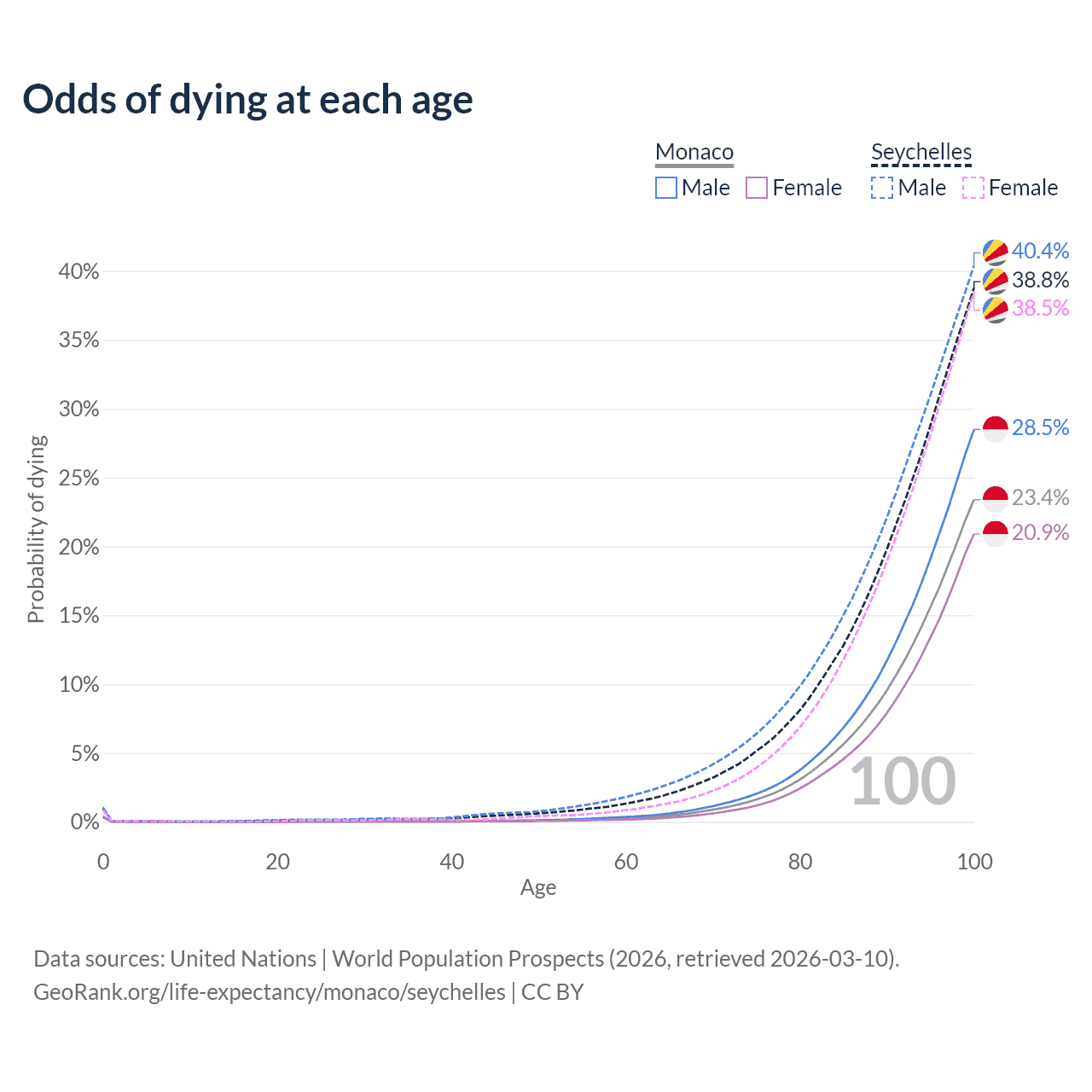 This life expectancy calculator shows the odds of living to 100, 95, 90, and below based on current age for both males and females in Monaco and the Seychelles, along with mean and median age of death. The calculations are based on the 2026 life tables (actuarial tables) from the UN World Population Prospects.