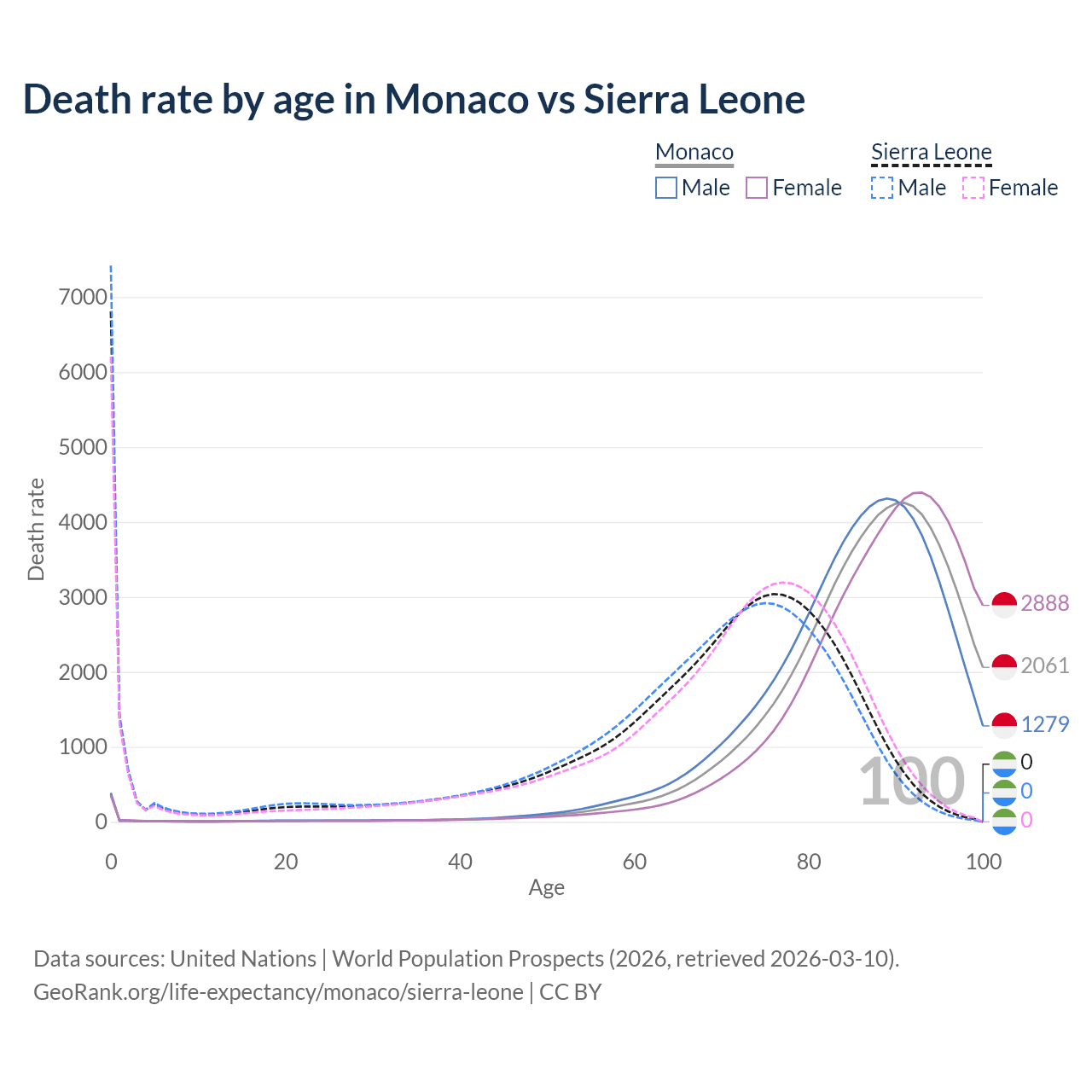 In Monaco, the most common age of death is 91, compared to 0 in Sierra Leone. The median age of death is 88.7 in Monaco and 70.8 in Sierra Leone, meaning only half of each cohort is expected to live past that age.