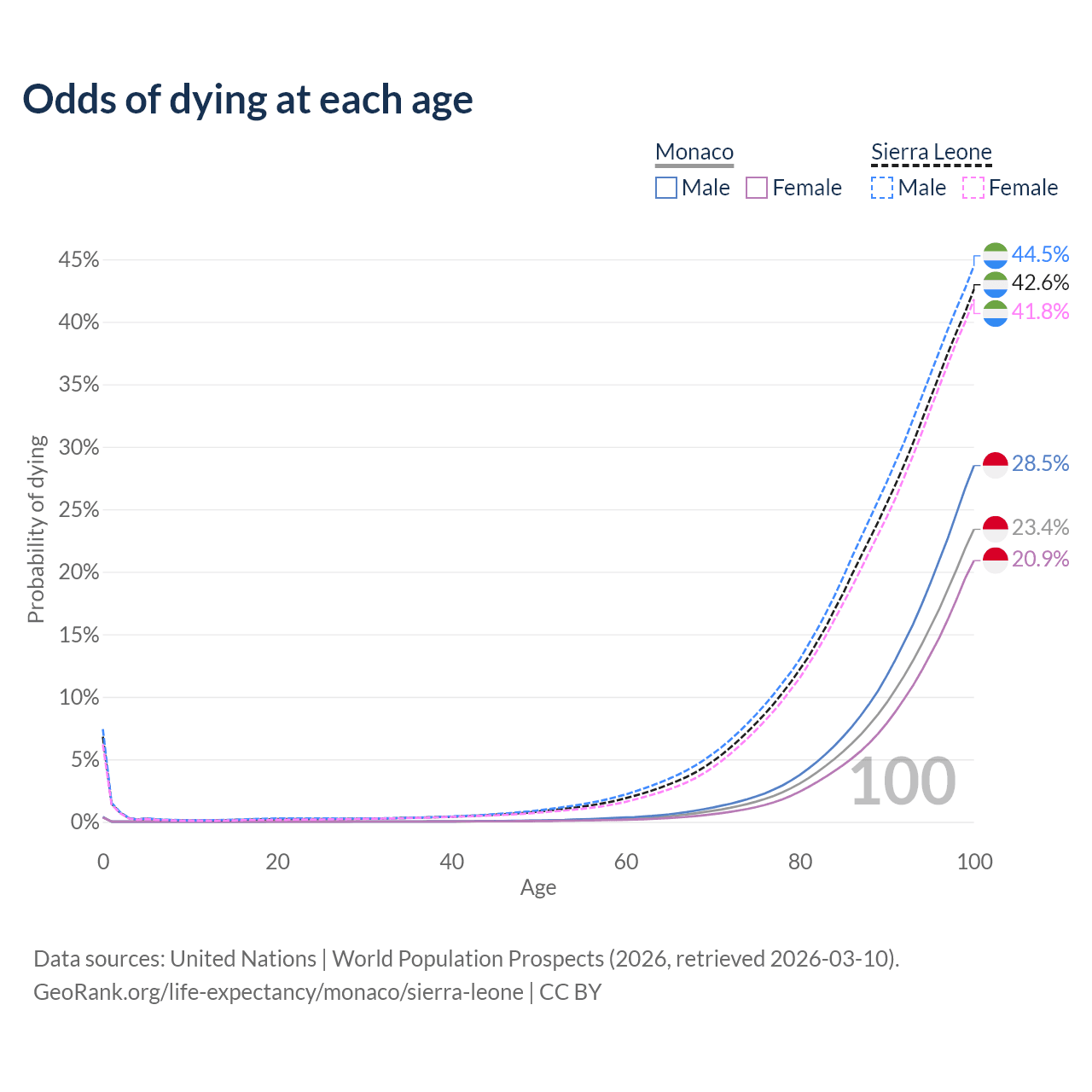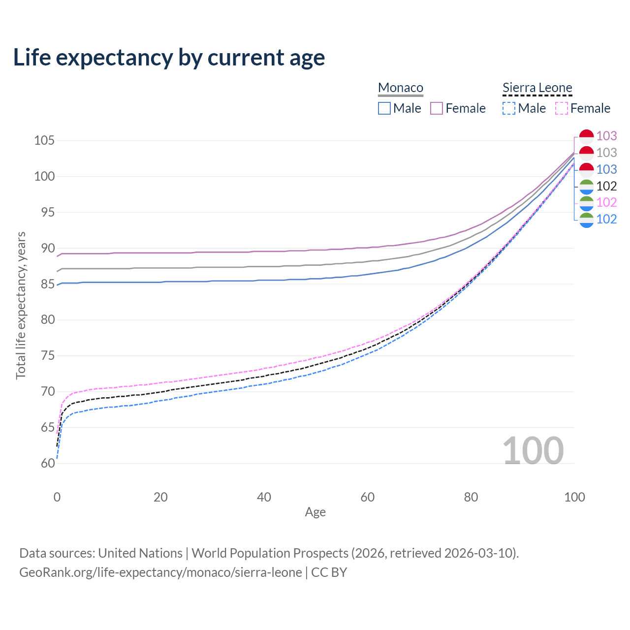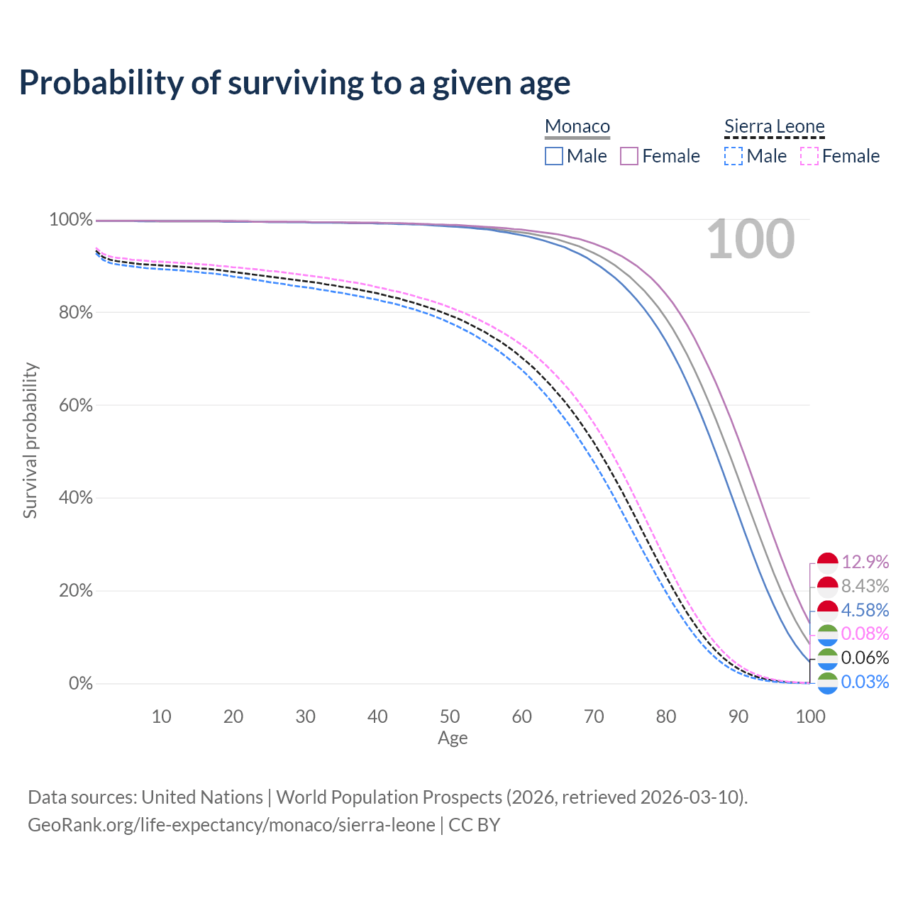 This life expectancy calculator shows the odds of living to 100, 95, 90, and below based on current age for both males and females in Monaco and Sierra Leone, along with mean and median age of death. The calculations are based on the 2026 life tables (actuarial tables) from the UN World Population Prospects.
