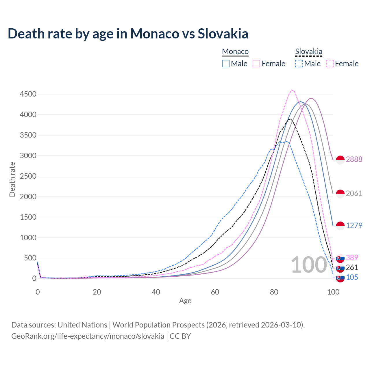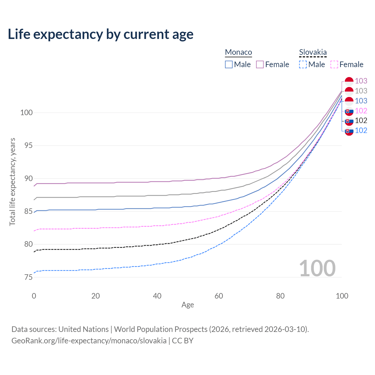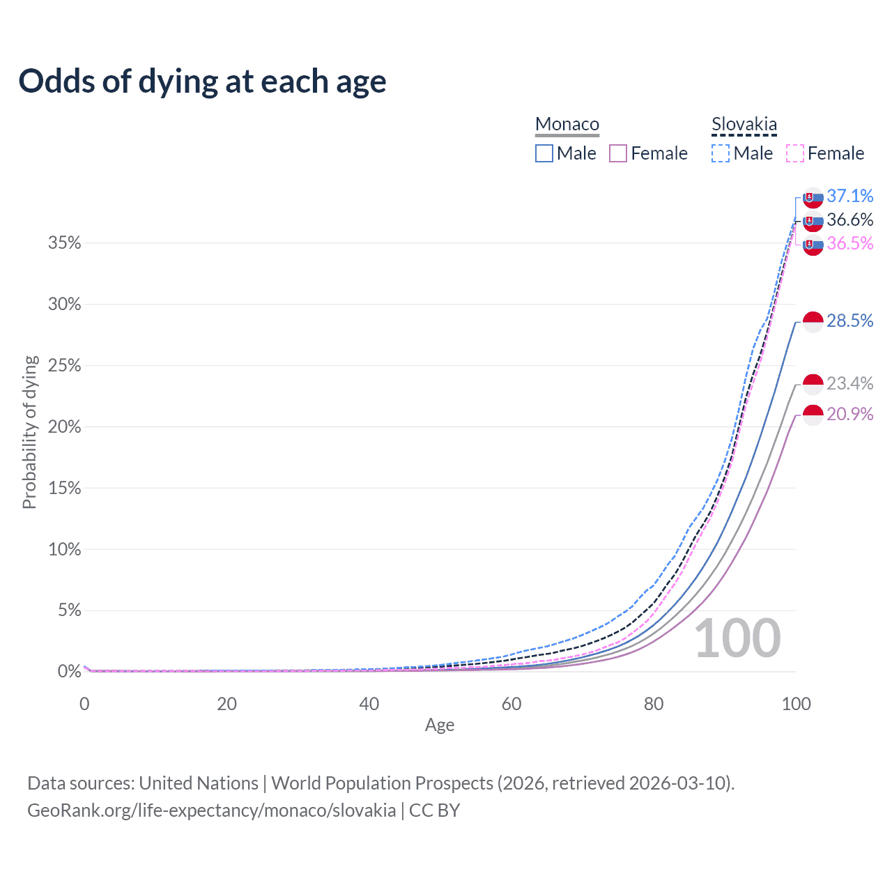 This life expectancy calculator shows the odds of living to 100, 95, 90, and below based on current age for both males and females in Monaco and Slovakia, along with mean and median age of death. The calculations are based on the 2026 life tables (actuarial tables) from the UN World Population Prospects.
