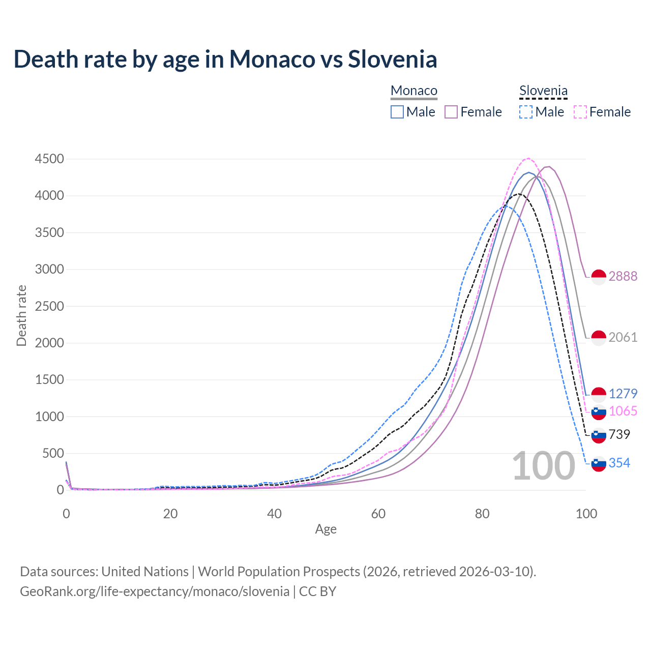 In Monaco, the most common age of death is 91, compared to 87 in Slovenia. The median age of death is 88.7 in Monaco and 84.4 in Slovenia, meaning only half of each cohort is expected to live past that age.