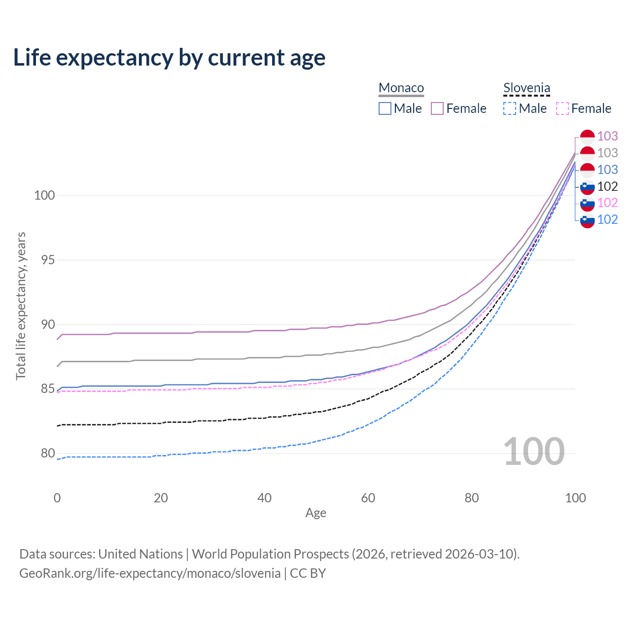 This life expectancy calculator shows the odds of living to 100, 95, 90, and below based on current age for both males and females in Monaco and Slovenia, along with mean and median age of death. The calculations are based on the 2026 life tables (actuarial tables) from the UN World Population Prospects.