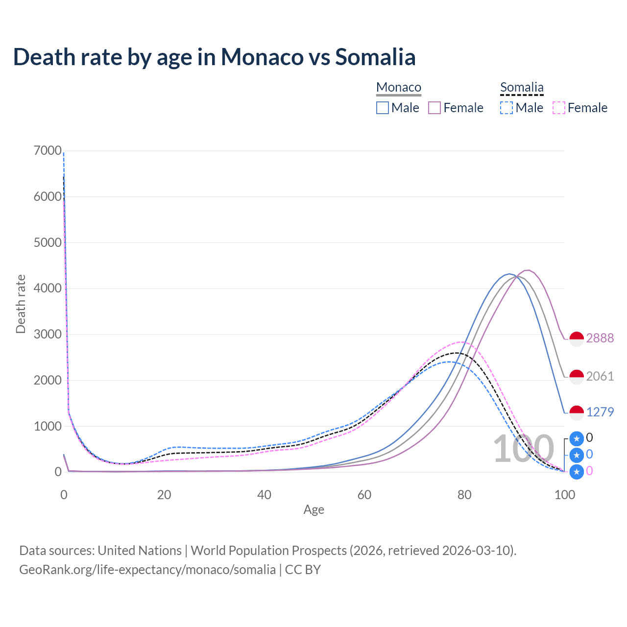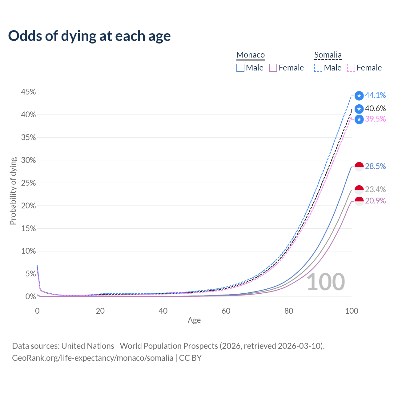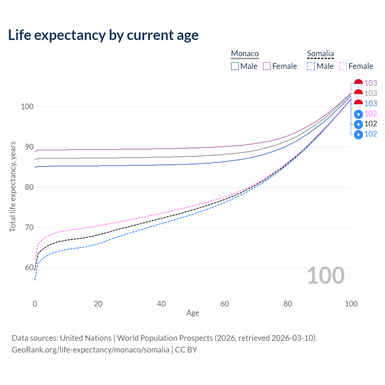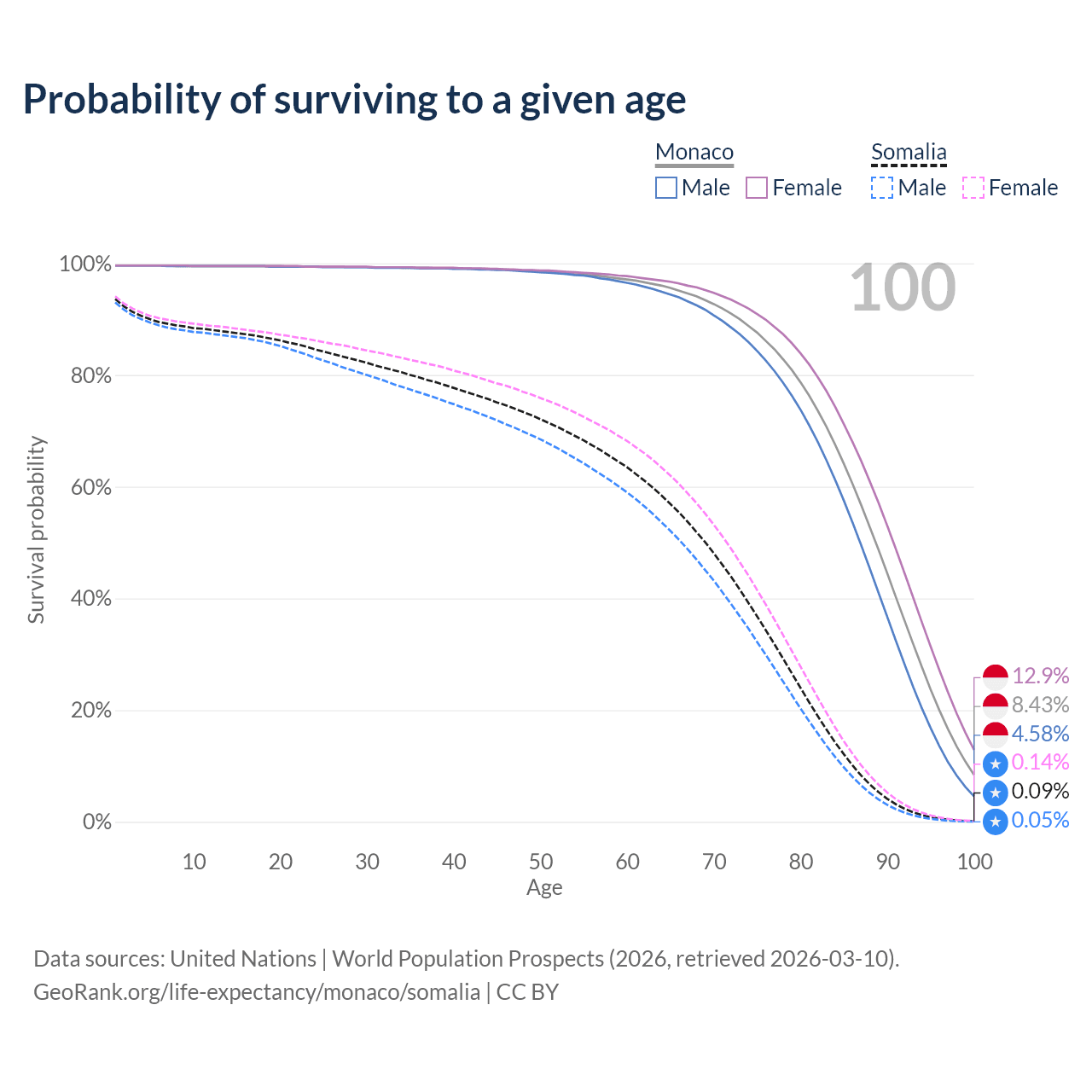 This life expectancy calculator shows the odds of living to 100, 95, 90, and below based on current age for both males and females in Monaco and Somalia, along with mean and median age of death. The calculations are based on the 2026 life tables (actuarial tables) from the UN World Population Prospects.