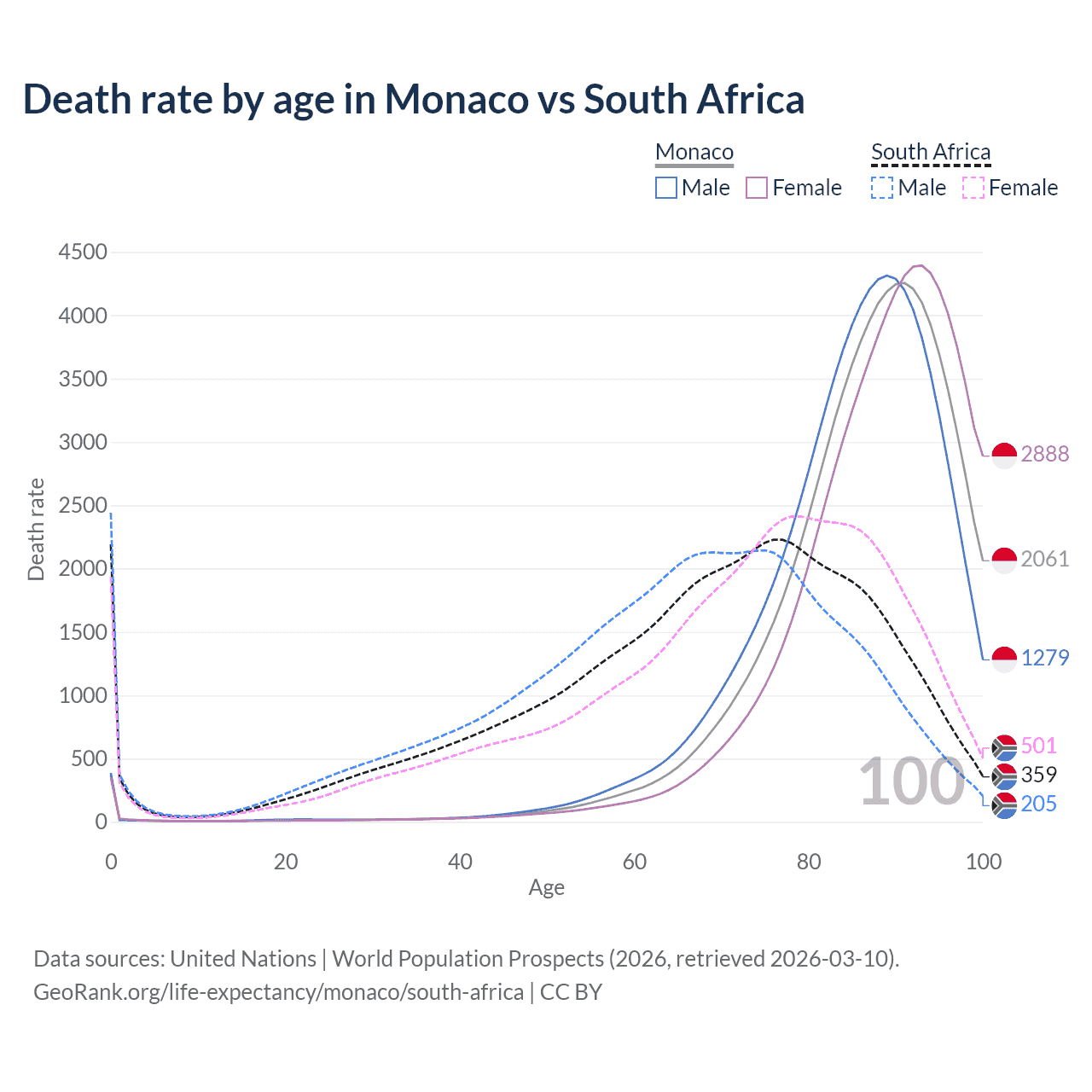 In Monaco, the most common age of death is 91, compared to 77 in South Africa. The median age of death is 88.7 in Monaco and 70.8 in South Africa, meaning only half of each cohort is expected to live past that age.