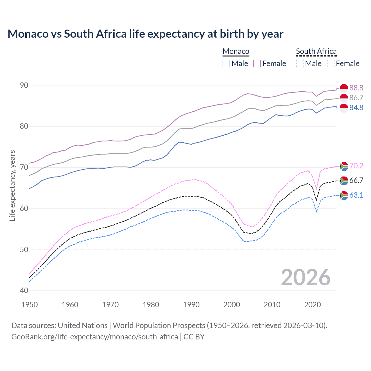 The average life expectancy at birth is 86.7 years in Monaco vs 66.7 in South Africa. Monaco is ranked 1/197 by life expectancy, and South Africa is 164/197. In Monaco, the life expectancy is 84.8 years for males and 88.8 years for females. In South Africa, it's 63.1 years for males and 70.2 years for females.