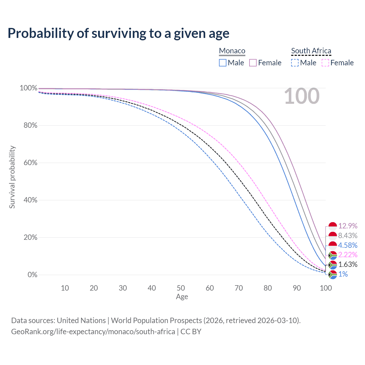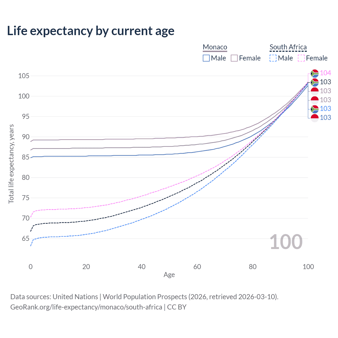 This life expectancy calculator shows the odds of living to 100, 95, 90, and below based on current age for both males and females in Monaco and South Africa, along with mean and median age of death. The calculations are based on the 2026 life tables (actuarial tables) from the UN World Population Prospects.