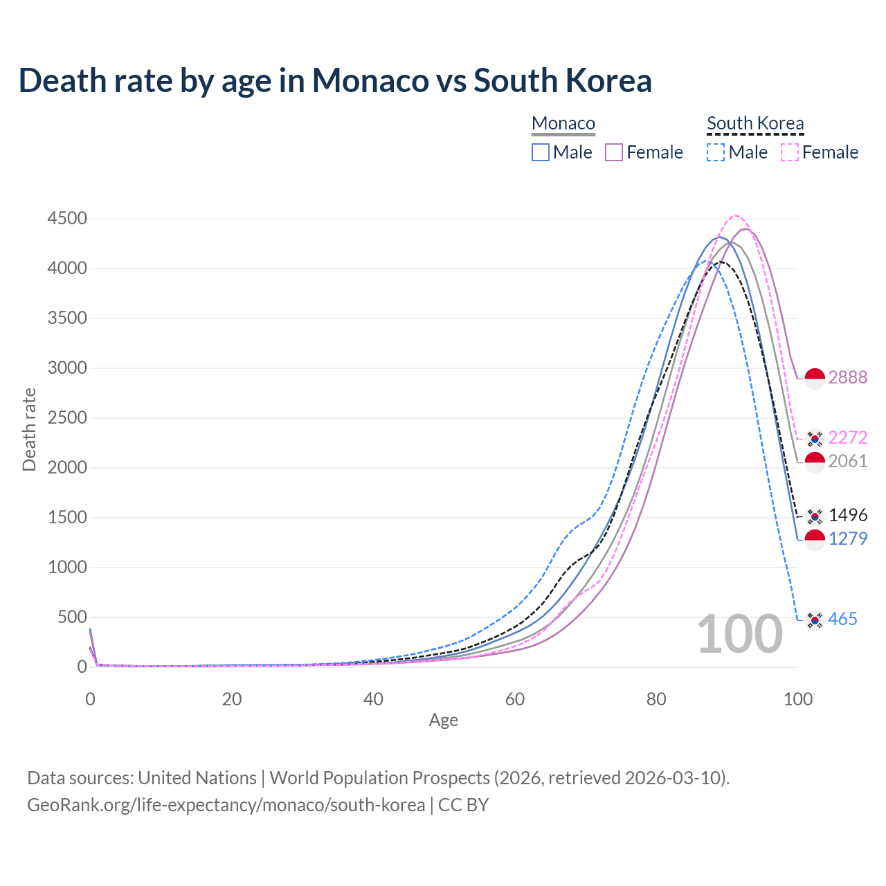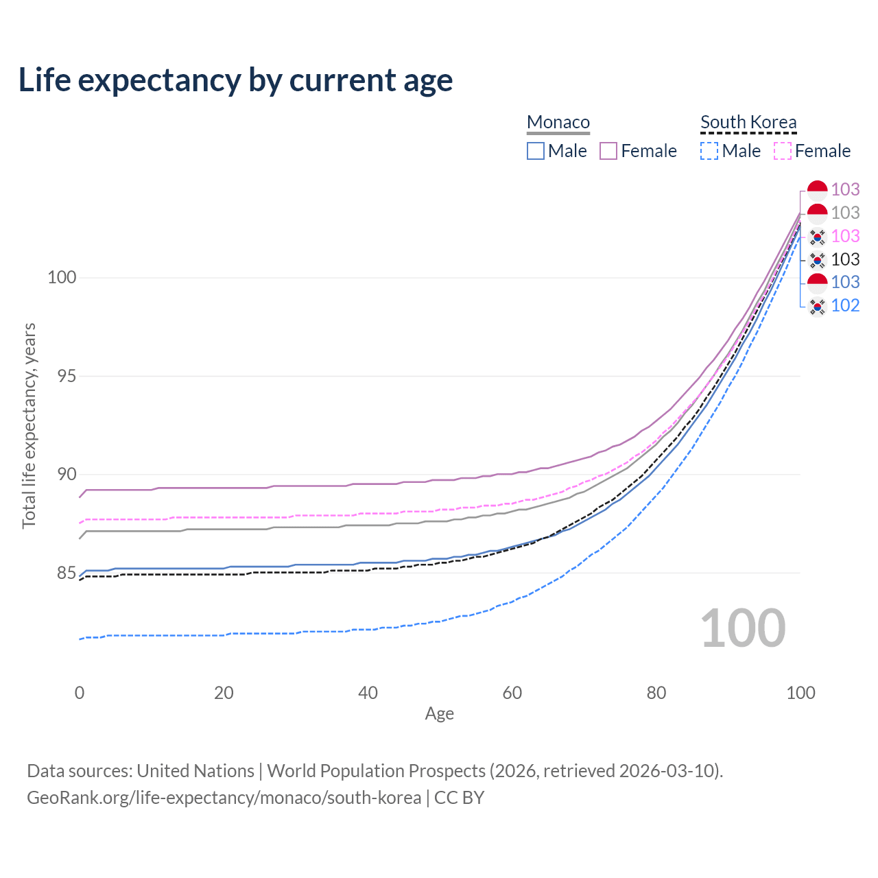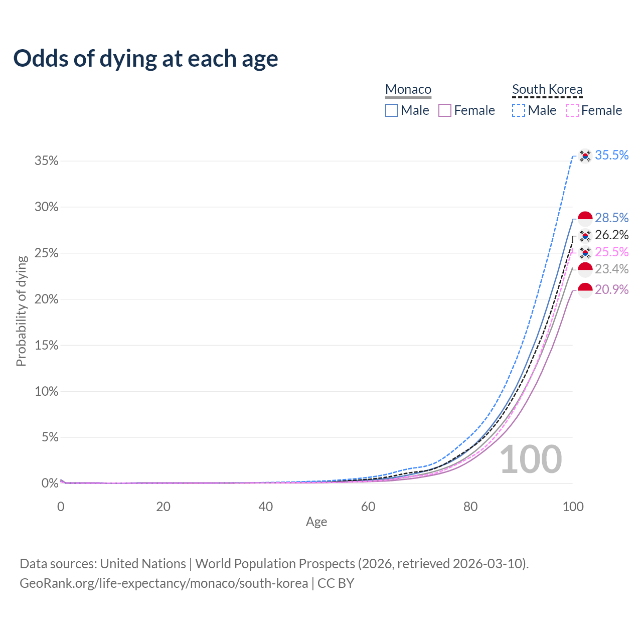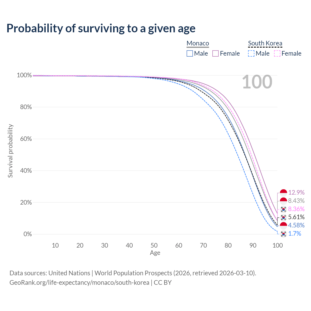 This life expectancy calculator shows the odds of living to 100, 95, 90, and below based on current age for both males and females in Monaco and South Korea, along with mean and median age of death. The calculations are based on the 2026 life tables (actuarial tables) from the UN World Population Prospects.