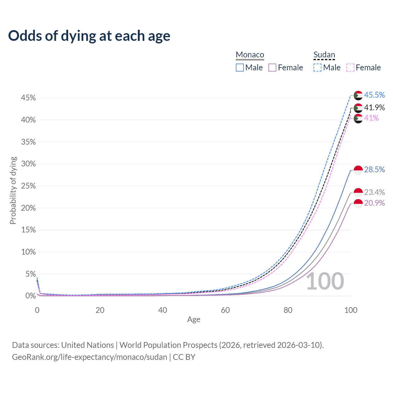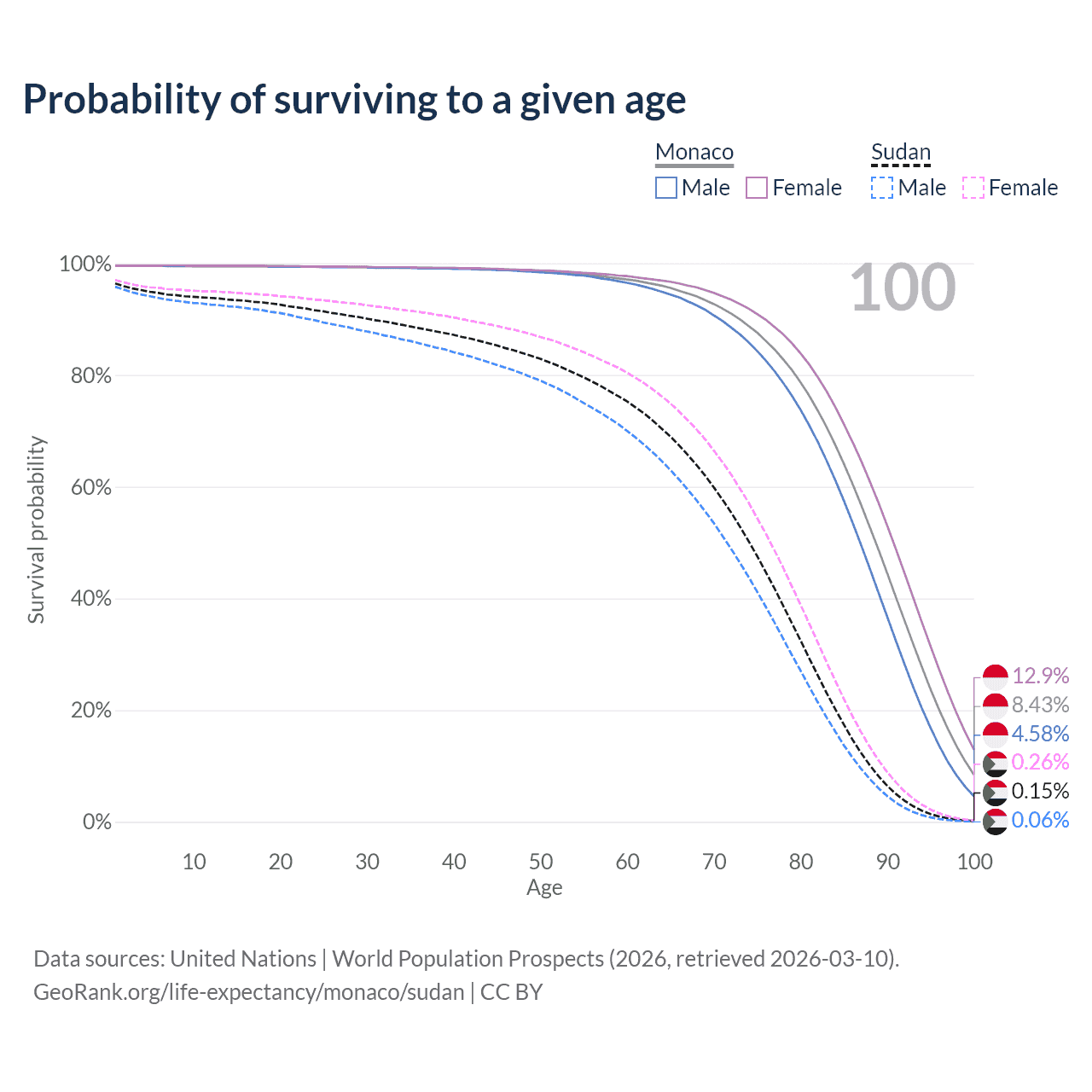 This life expectancy calculator shows the odds of living to 100, 95, 90, and below based on current age for both males and females in Monaco and Sudan, along with mean and median age of death. The calculations are based on the 2026 life tables (actuarial tables) from the UN World Population Prospects.