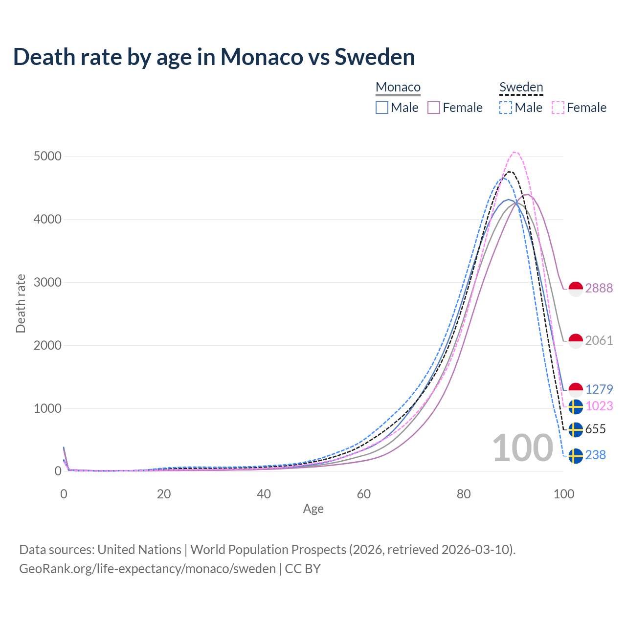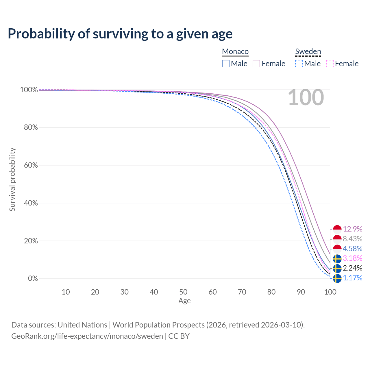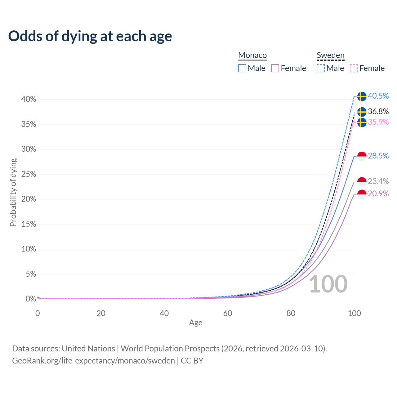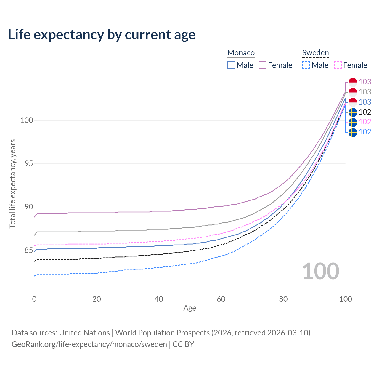 This life expectancy calculator shows the odds of living to 100, 95, 90, and below based on current age for both males and females in Monaco and Sweden, along with mean and median age of death. The calculations are based on the 2026 life tables (actuarial tables) from the UN World Population Prospects.