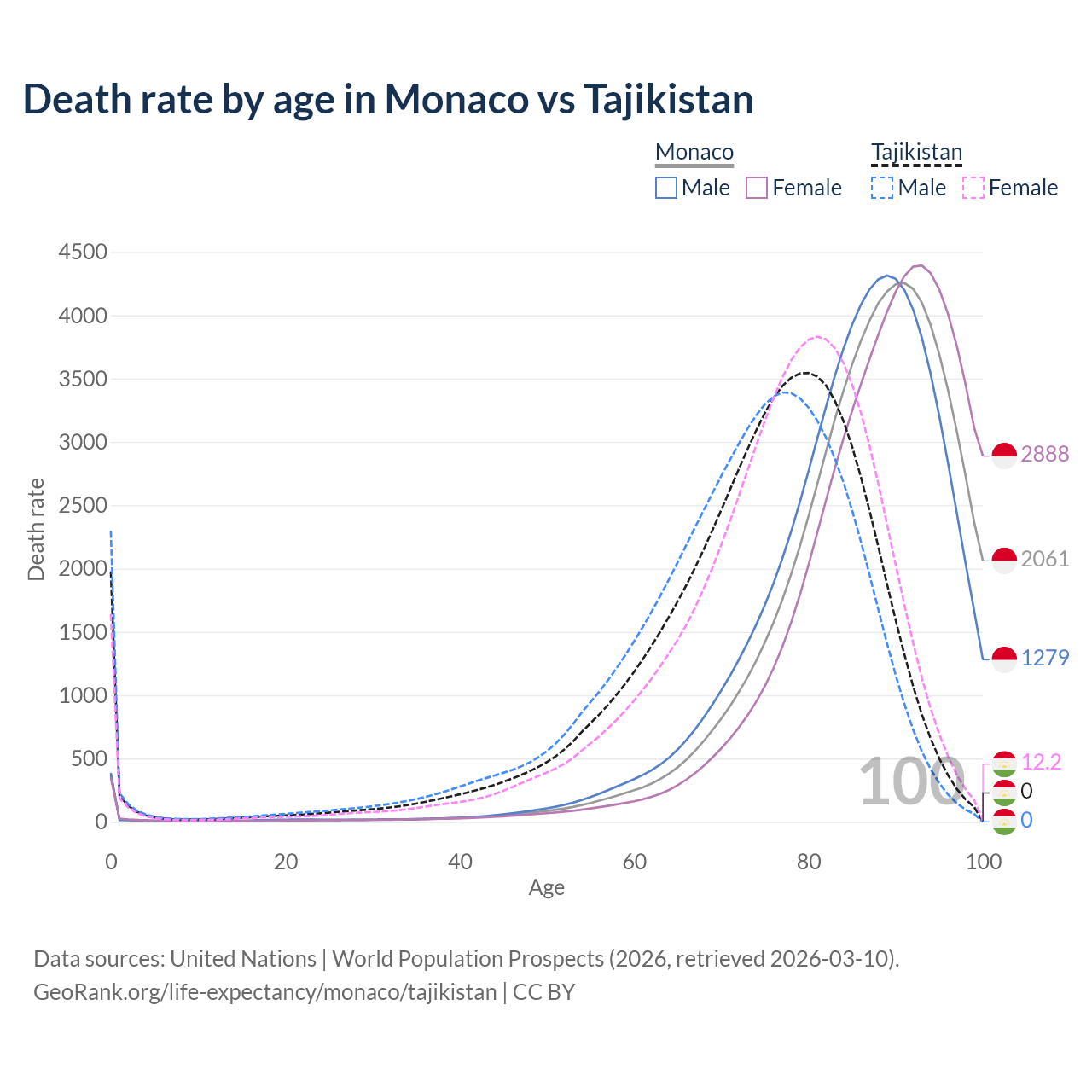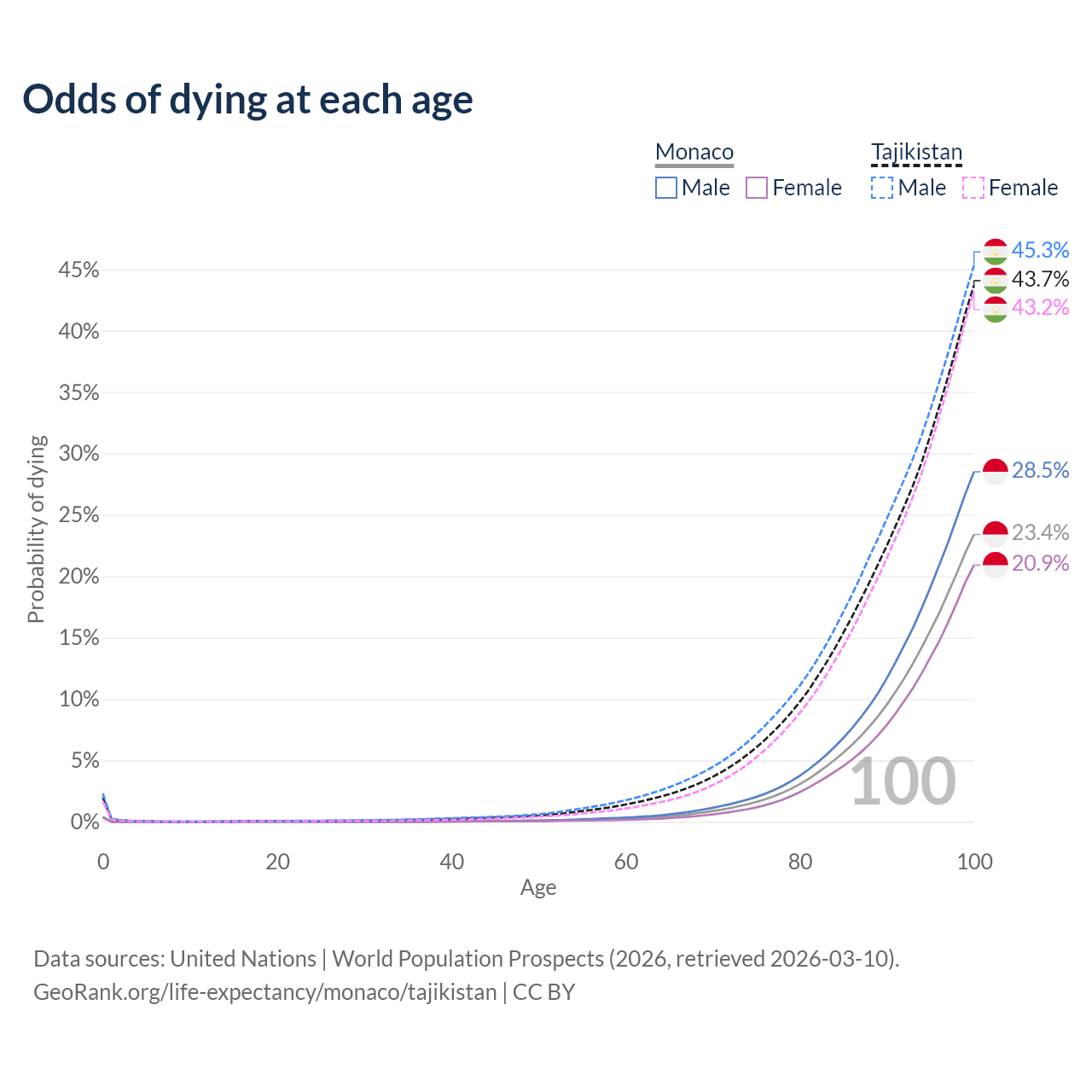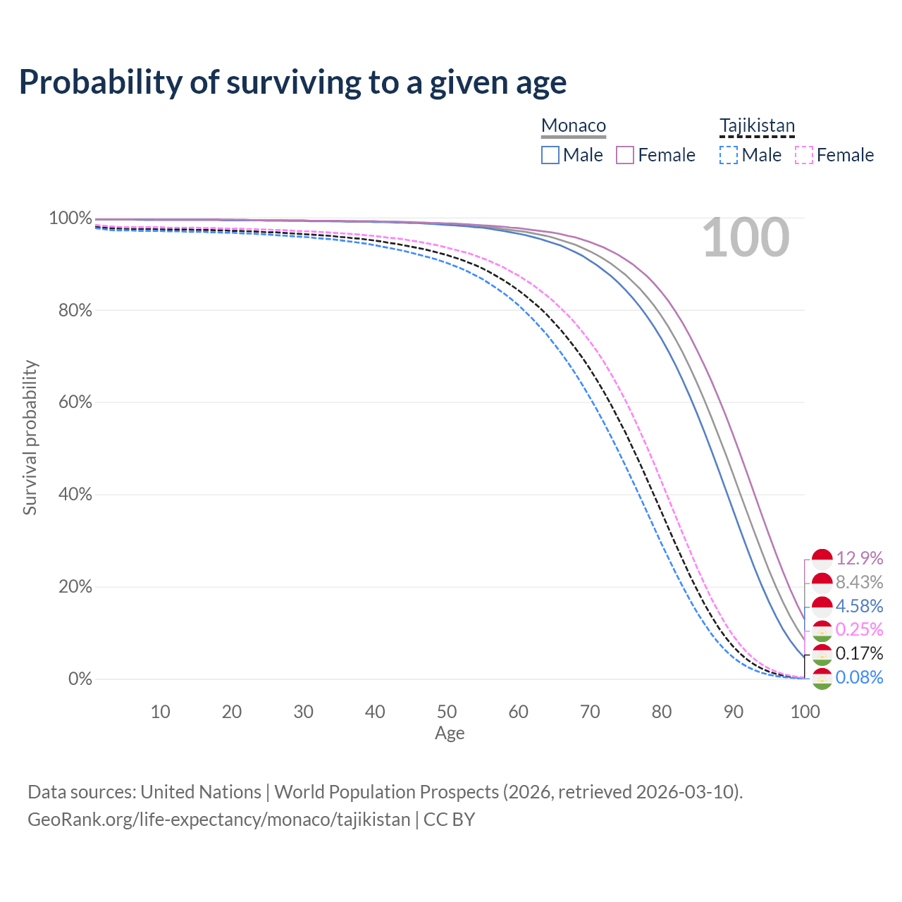 This life expectancy calculator shows the odds of living to 100, 95, 90, and below based on current age for both males and females in Monaco and Tajikistan, along with mean and median age of death. The calculations are based on the 2026 life tables (actuarial tables) from the UN World Population Prospects.
