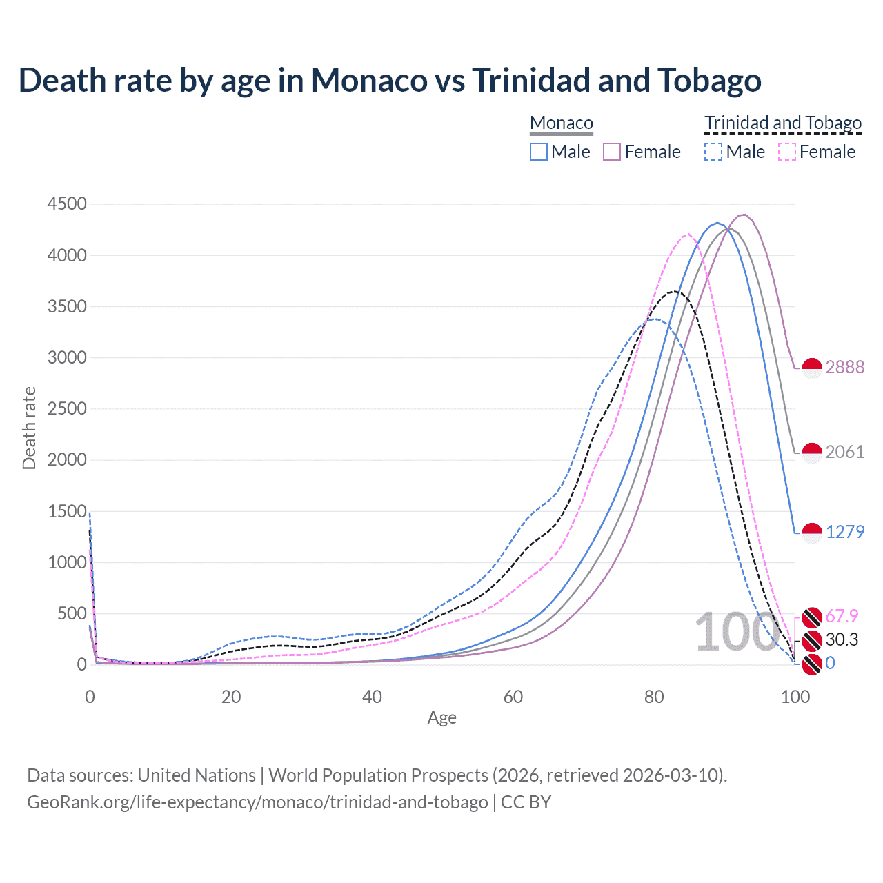 In Monaco, the most common age of death is 91, compared to 83 in Trinidad and Tobago. The median age of death is 88.7 in Monaco and 78.4 in Trinidad and Tobago, meaning only half of each cohort is expected to live past that age.