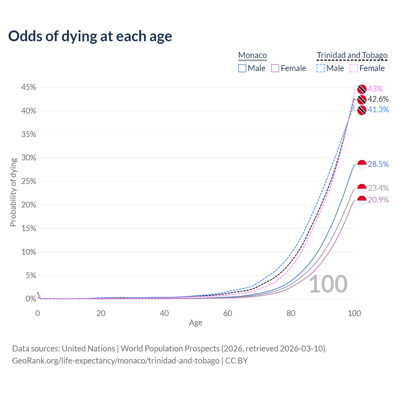 This life expectancy calculator shows the odds of living to 100, 95, 90, and below based on current age for both males and females in Monaco and Trinidad and Tobago, along with mean and median age of death. The calculations are based on the 2026 life tables (actuarial tables) from the UN World Population Prospects.