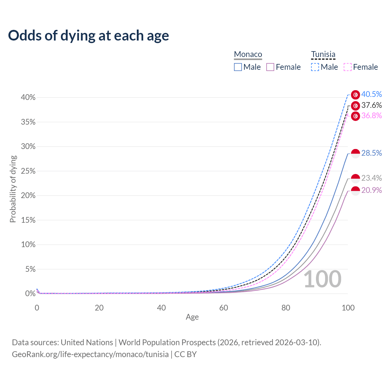 This life expectancy calculator shows the odds of living to 100, 95, 90, and below based on current age for both males and females in Monaco and Tunisia, along with mean and median age of death. The calculations are based on the 2026 life tables (actuarial tables) from the UN World Population Prospects.